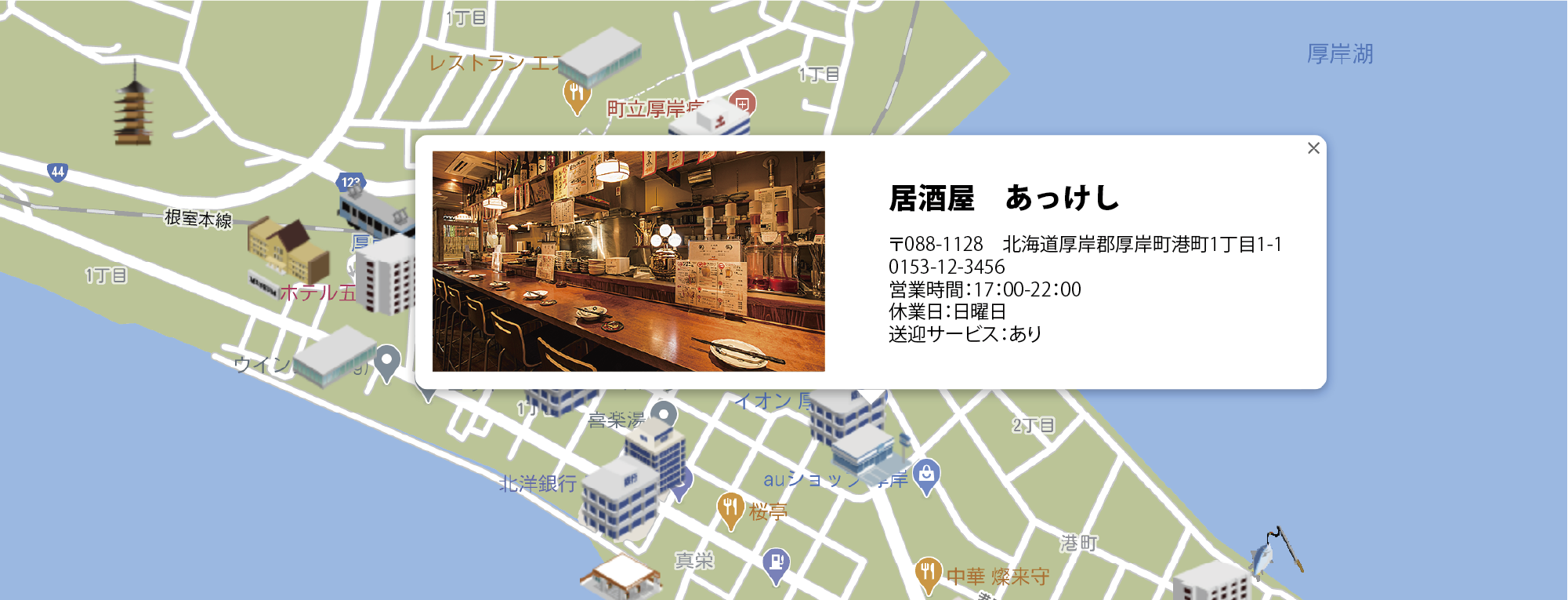 1.厚岸の観光スポットや商店街マップを組み合わせたマップ(現況稼働中)