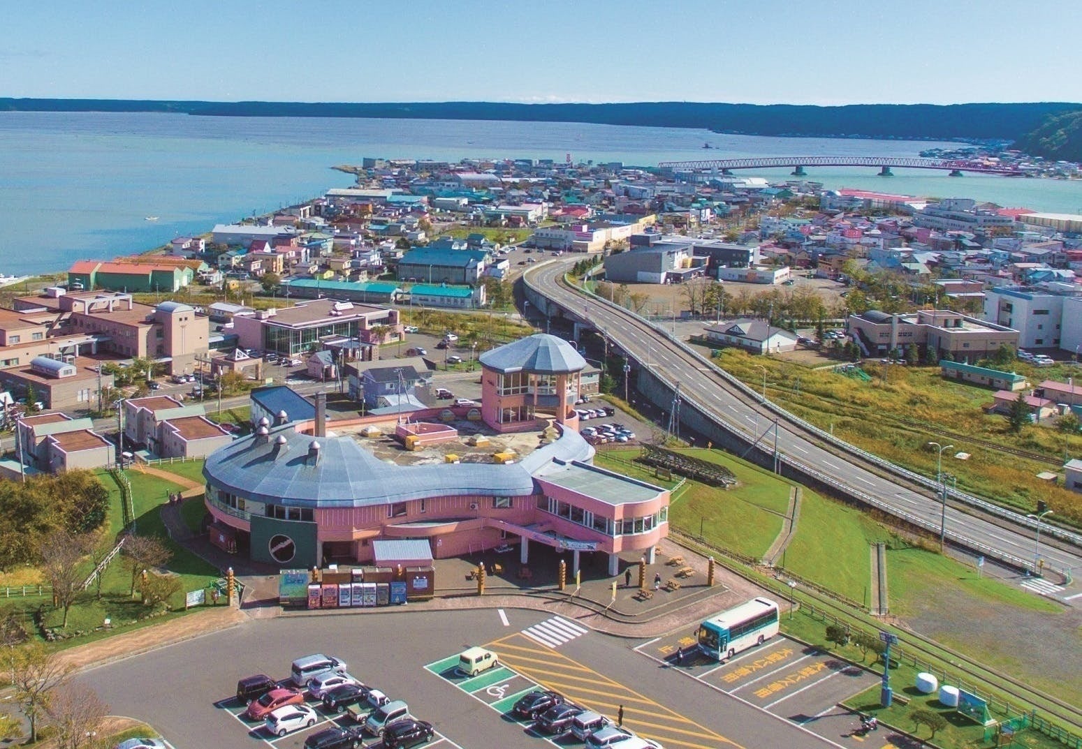 【コンキリエ(手前)から厚岸湖(橋から左側)と厚岸湾(橋から右側)】