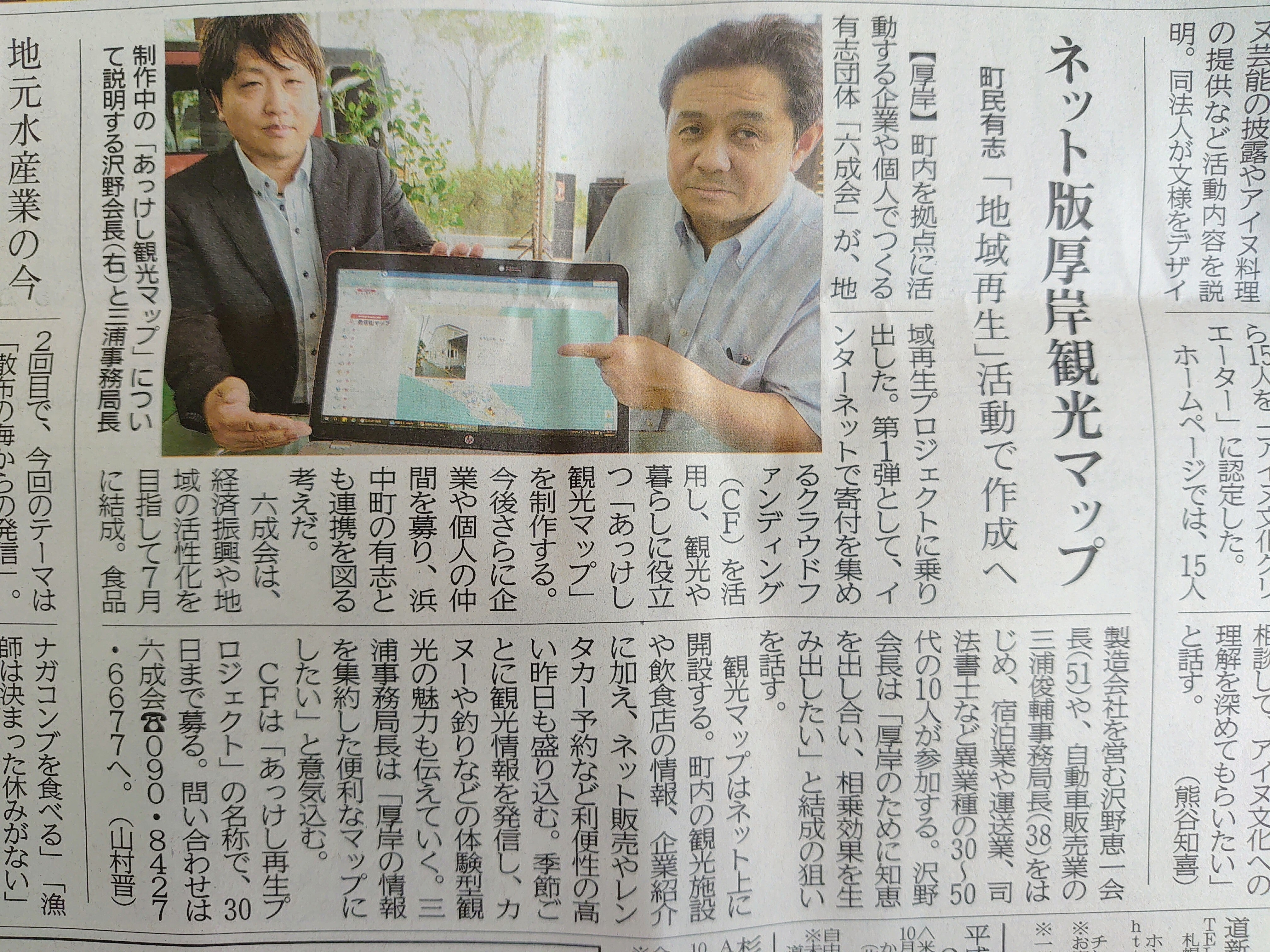 2020/09/29 10:06北海道新聞に我々六成会が記事として掲載させて貰いました。紙面では伝えきれない思いがまだまだ沢山ございますが、全員で一丸となり厚岸を盛り上げて行きたいと思います。そのためにはまずは疲弊した経済の復興だと思っております。是が非でも目的を実現させるためにあっけし観光マップというポータルサイトを活用し、町内外を結ぶドアとして観光誘致、町民誘致、企業誘致など様々な活動をして参りたいと思います。 もっと見る
