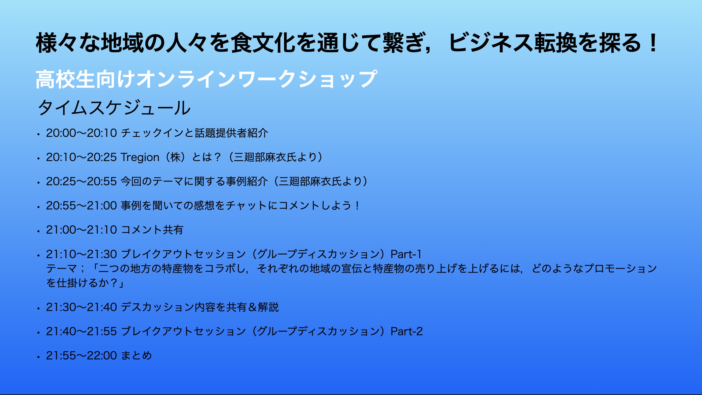 CAP高等学院では,9月15日(火)20:00〜22:00に高校生向けワークショップ第2弾を開催致します.今回のテーマは「地方と地方をつなぐビジネスについて」です.地方の特産物をコラボすることでファンを増やし,ビジネスの広がりを感じてもらう学校の学びとはまた一味違うものとなります.高校生の皆さんは,是非とも奮ってご参加ください.また,高校生のお子様をお持ちの保護者の方や高校の先生方におかれましても,是非ともご紹介をいただき,ご参加を促して頂けますと幸いです.定員は30名とさせて頂きます.