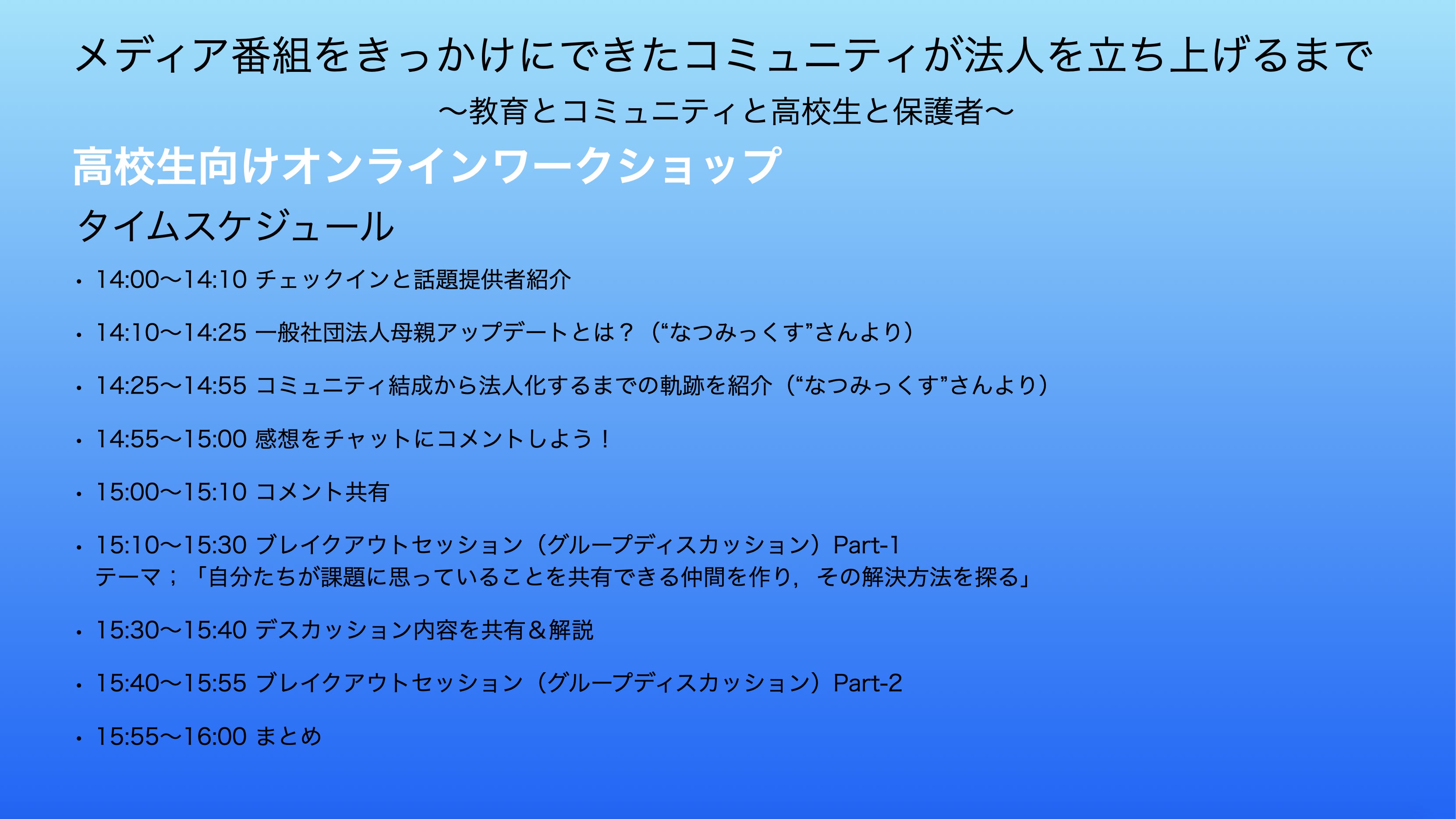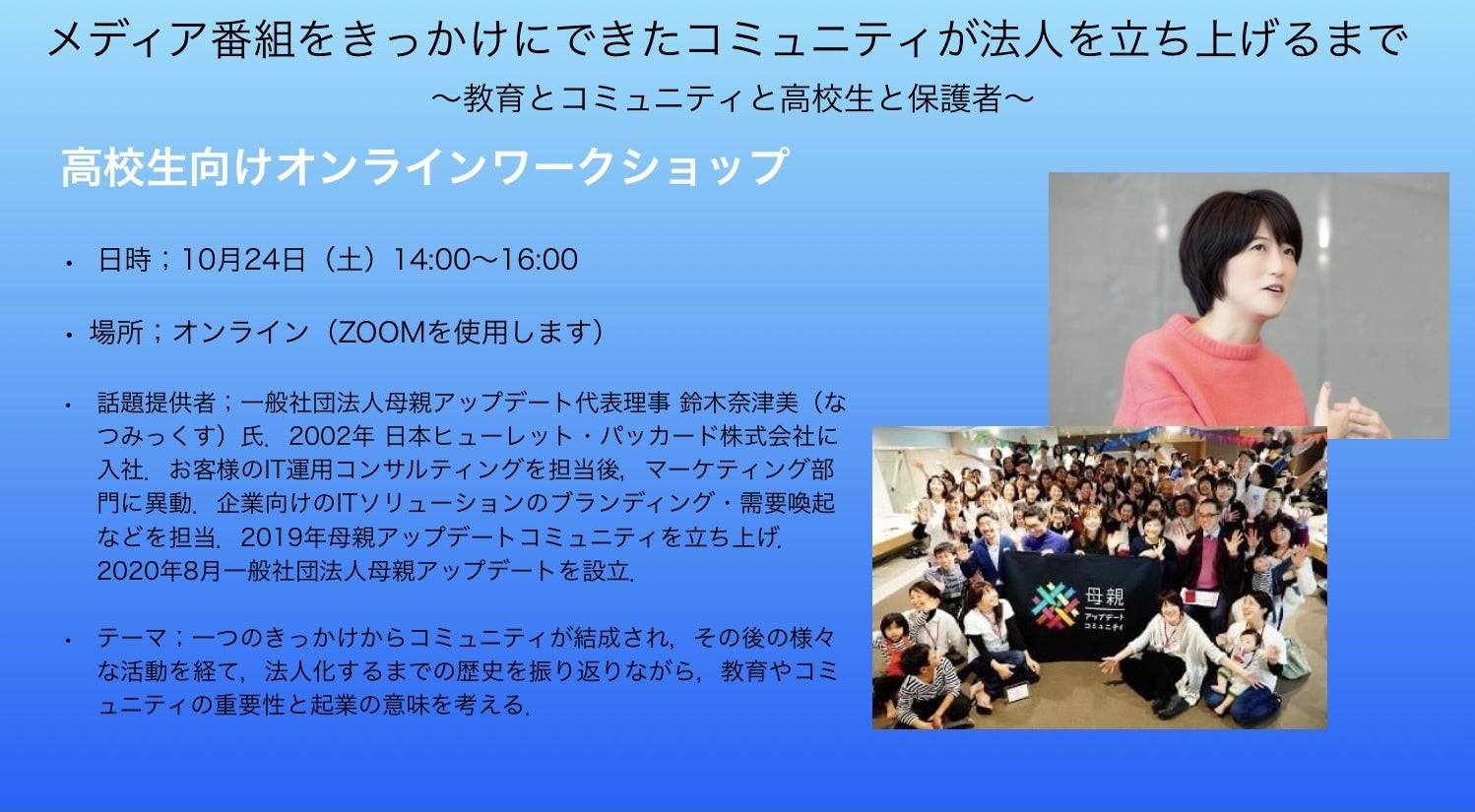 10月24日(土)14:00〜16:00開催!高校生向けオンラインワークショップ「メディア番組をきっかけにできたコミュニティが法人を立ち上げるまで〜教育とコミュニティと高校生と保護者〜」