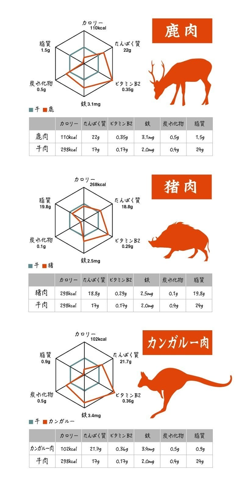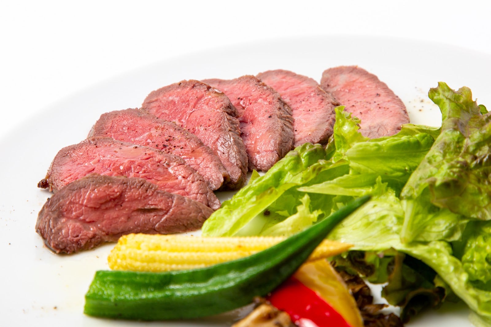 北海道産のエゾ鹿は鉄分豊富で脂肪分・カロリー控えめなので体を引き締めたい方にもオススメです。牛肉をタンパクにしたようなクセのない味わい。