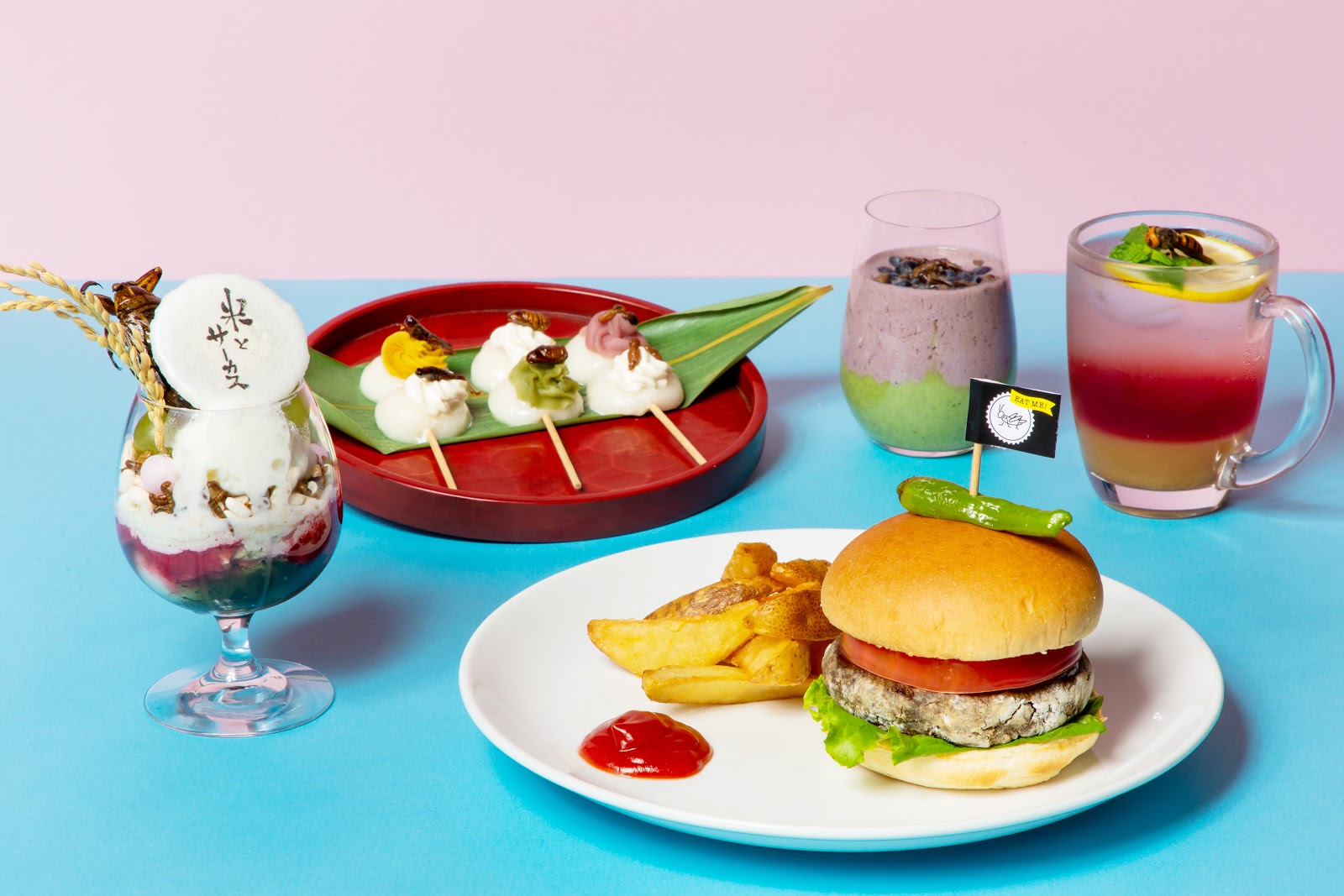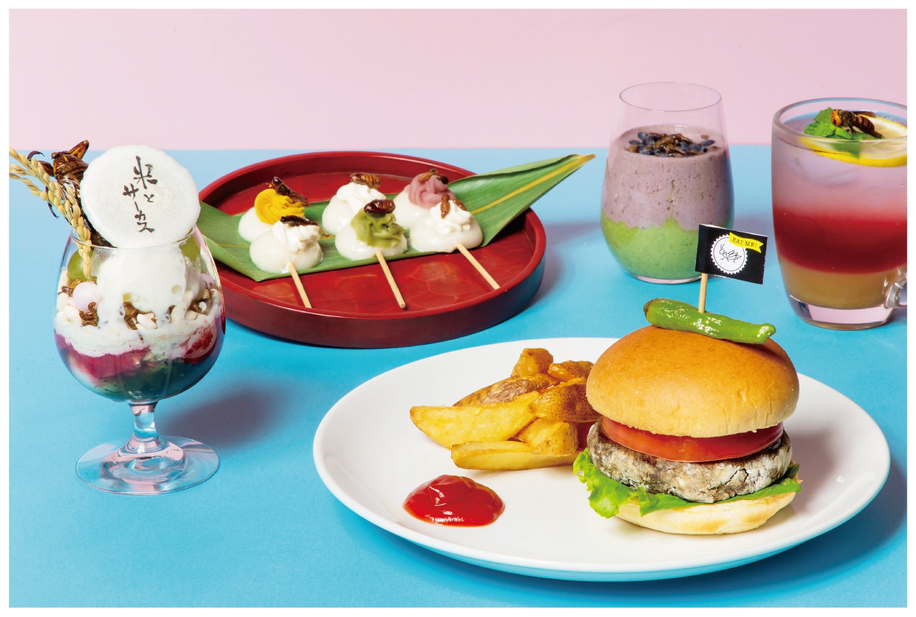 左からMUSHIパフェ/MUSHIだんご/コオロギバーガー/MUSHIスムージー/MUSHIソーダ