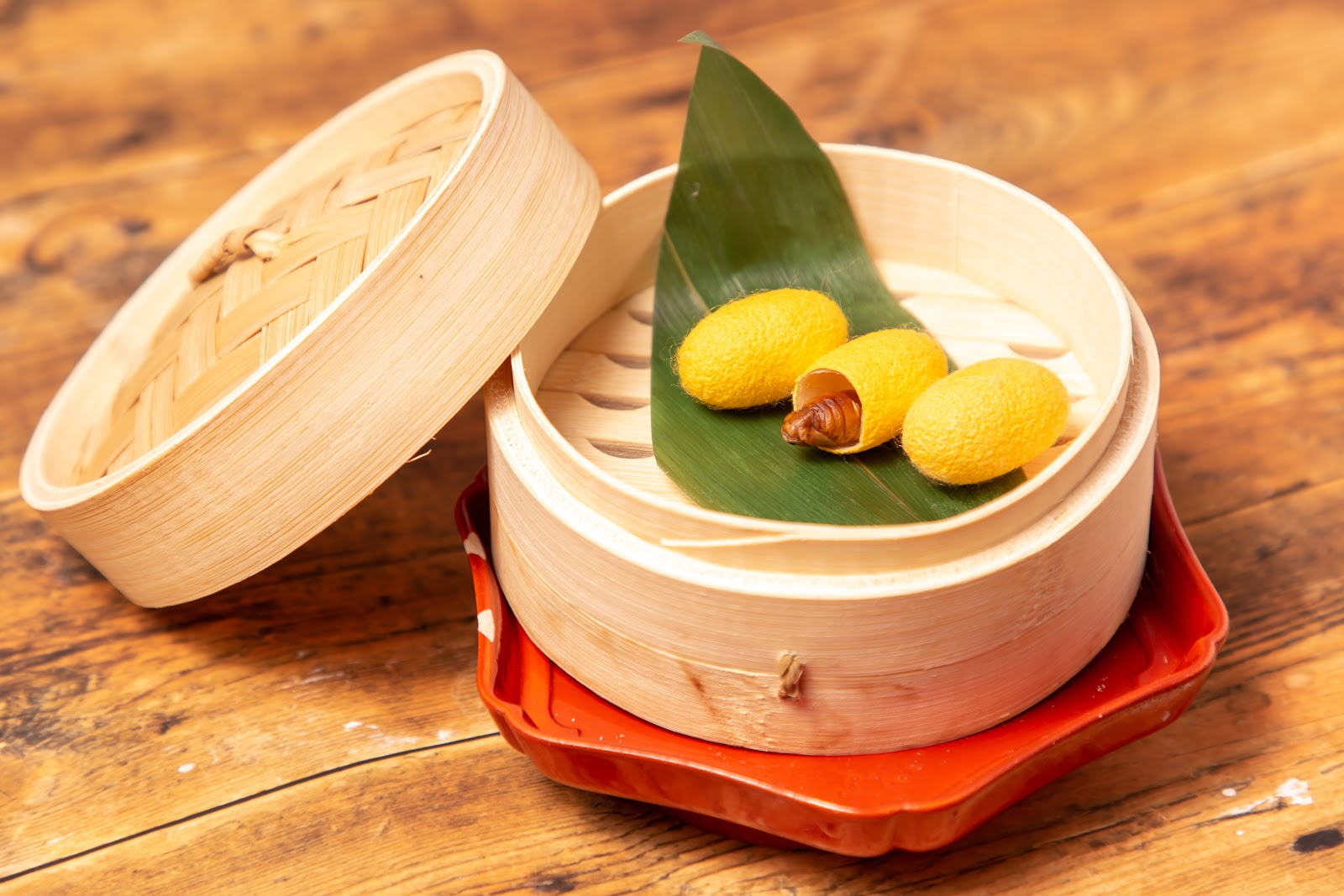 米とサーカススタッフがその美味しさに一番感動した昆虫です。京都で製糸のために育てているふっくらした蚕は、タンパク質豊富でビタミンB2が豊富に含まれています。