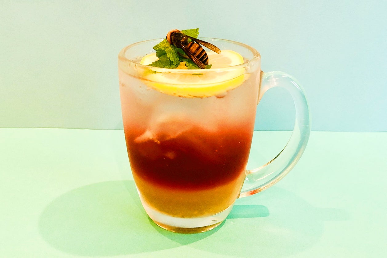 コオロギとハチミツ、ハイビスカス、ジンジャーをソーダで仕上げました。