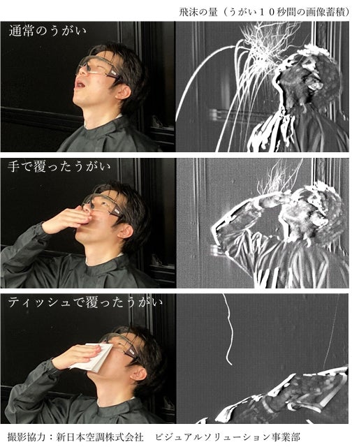 私自身、うがいがそんなに多くの飛沫を発生させているとは予想していませんでしたが、新日本空調株式会社の協力をえてうがいの際に出る飛沫を観測したところ、びっくりする量の飛沫が出ていました。