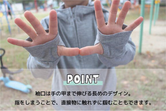 袖口は手の甲まで伸びる長めのデザイン。指をしまうことで、直接物に触れずに掴むことも出来ます。