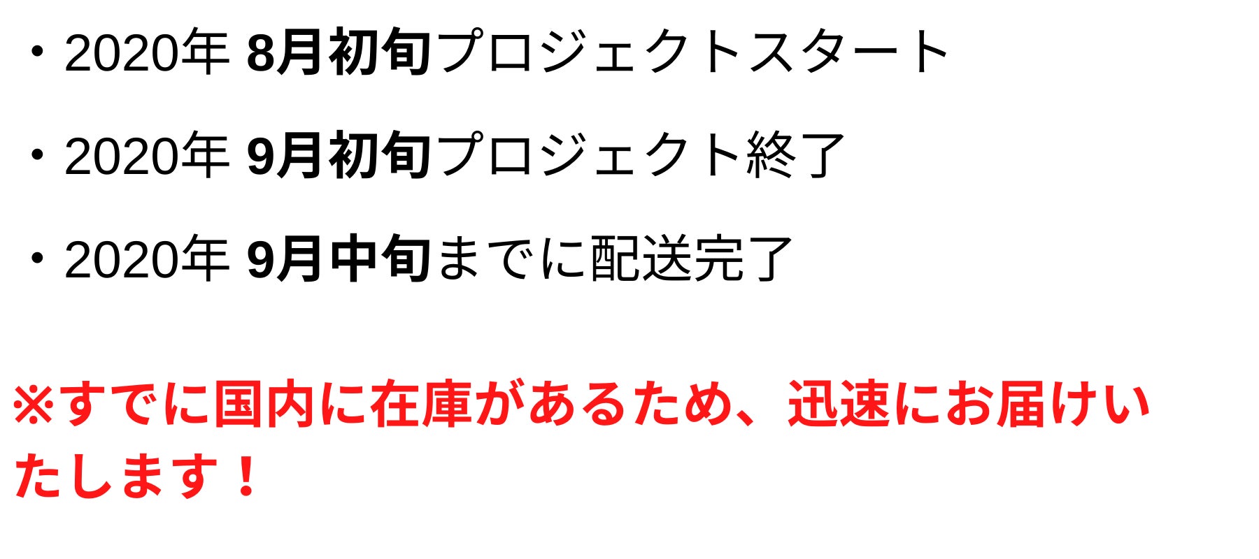 ◯ 引渡し時期: 各リターン詳細に記載の発送予定月を引き渡し時期とします。但し、開発・生産状況によって遅れが生じる場合がありますのでその際は当プロジェクトページ内の「活動報告」または購入者へのメール等で連絡します。