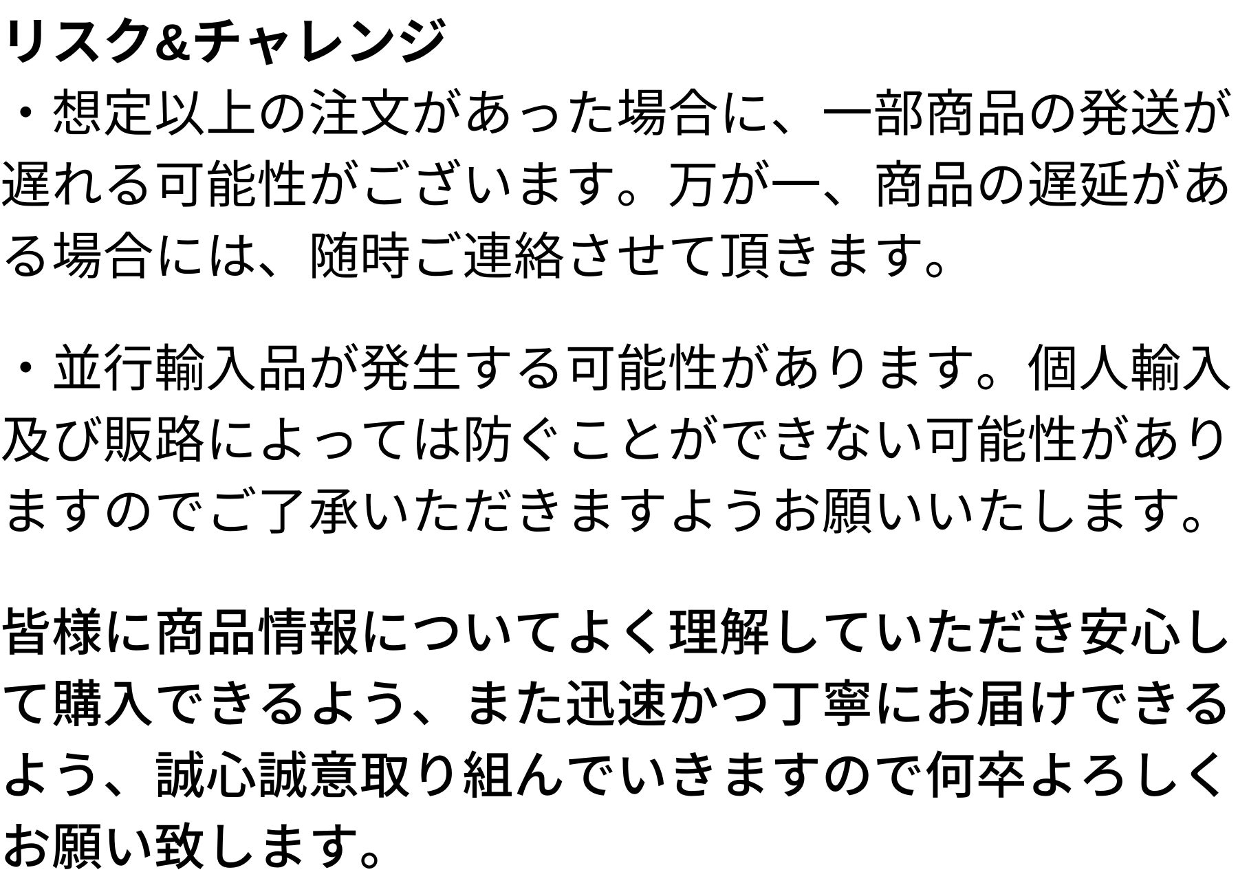 ◯ キャンセル・返品: 当プロジェクトは「All-in型」の為、お申込み完了をもって契約が成立いたします。その為、お客様都合による返品・キャンセルはできませんのでご注意ください。尚、製品到着後に破損や初期不良がある場合には交換させていただきますので「メッセージで意見や問い合わせを送る」から、または納品書記載の連絡先までお問い合わせください。