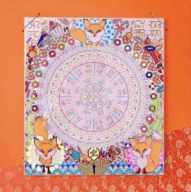本日は、寺原沙織さんのリターン作品、龍体文字の護符アート『野狐3匹と、宝船』のご紹介をしたいと思います。