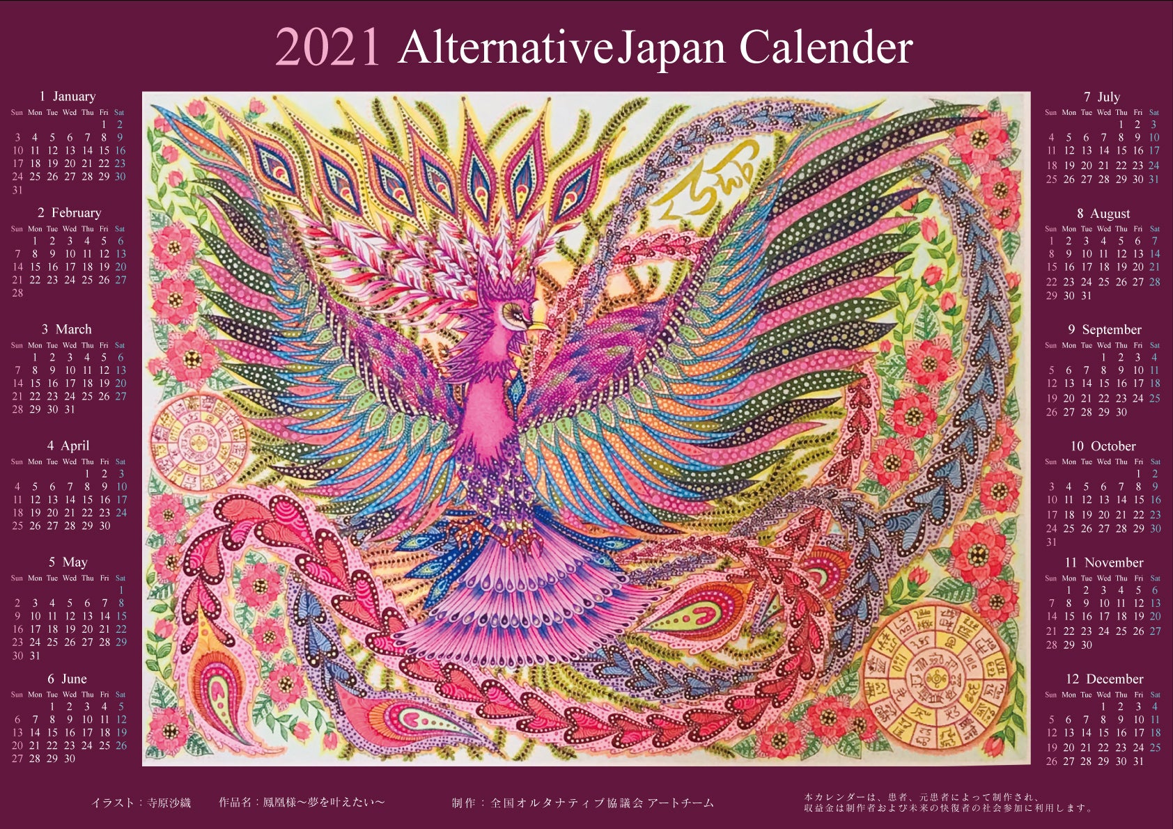 ONE LINE ARTIST 曽良貞義さんの作品『2020.2.22.22:22』(完成年月日 2020.2.22) こんばんは。夜分遅くにごめんなさい。皆様、お久しぶりでございますが、如何お過ごしでしょうか…?募集期間終了後、約2ヶ月ぶりの活動報告となります。募集期間中は、皆様のご支援とご協力に支えて頂き、大変お世話になりました。本当に、ありがとうございました。また、今回もこの活動報告をご覧下さりありがとうございます。本日は、【ご報告と御礼 part.13】オルタナティブ協議会2021年カレンダー・印刷完了のお知らせ・一般販売のお知らせ・リターン発送のお知らせをお届けしたいと思います♪…………………………………………………………………【印刷完了のお知らせ】オルタナティブ協議会2021年カレンダー③種類、無事刷り上がり完成致しました〜!♪♪♪カレンダーの実物ですが、今までご紹介させて頂いていた画像(画面でご覧頂いていたもの)よりも、若干色味が濃く印刷されております。改めて、カレンダー③種類の、より実物に近い色味の画像を掲載致しますので、是非ご確認頂けたら幸いです。特に『CUBE』2021年カレンダーは、より青が深く、よりシックでかっこいい仕上がりとなっております。♪♪♪…………………………………………①『孔雀の舞』リニューアル2021年カレンダー(寺原沙織さんのイラスト)…………………………………………②『鳳凰様〜夢を叶えたい〜』2021年カレンダー(寺原沙織さんのイラスト)…………………………………………③『CUBE』2021年カレンダー(ONE LINE ARTIST 曽良貞義さんのイラスト)…………………………………………*掲載の画像と実際の印刷物では色味が多少異なる場合がございます。また、一部デザイン変更の場合もございますのでご了承下さいませ。*祝日・休日については、オリンピック特措法改正案成立前の、昨年の時点で決定していた日にちになっております。…………………………………………………………………【一般販売のお知らせ・ご注文方法】オルタナティブ協議会2021年カレンダー③種類は、一般販売もしております。手売り、メール、ネットショップにてお買い求め頂けます。手売り販売は、各地のサードオピニオン会やイベントにて承っております。その場でお支払い頂き、お持ち帰り頂けます。是非 実物をお手に取ってご覧頂けたら幸いです。メール、ネットショップでのご注文方法は下記をご覧下さいませ。…………………………………………✴︎✴︎✴︎ご注文方法✴︎✴︎✴︎✴︎メール✴︎全国オルタナティブ協議会へのメールに、2021年カレンダーご希望の旨を明記のうえ、以下の情報をお知らせ下さいませ。お支払いは、郵貯、銀行振り込みとなります。 返信メールにてお振込先をお伝え致します。・ご希望のカレンダーの種類・ご希望枚数・お届け先のご住所・お受け取り人の方のお名前全国オルタナティブ協議会info@alternativejapan.org✴︎ネットショップ✴︎オルタナショップ…………………………………………✴︎✴︎✴︎カレンダーの価格と仕様✴︎✴︎✴︎✴︎価格✴︎手売り販売1枚 1000円(税込)メール、オルタナショップでのご注文1枚 1200円 (送料・税込)✴︎仕様✴︎③種類共にサイズ:A2(約59.4cm × 約42cm)カレンダー1枚に12か月が掲載されているタイプです。…………………………………………………………………【リターン発送のお知らせ】只今、発送の準備をしております。12月4日〜順次発送の予定となっております。12月中には皆様のお手元にお届け出来ると思いますので、是非楽しみにして頂けたら幸いでございます。充分に確認した上で梱包、発送をしておりますが、もし、お届けのリターンが選んだものと違う、数が違う等のお間違い、また、傷、折れ等がございましたら、ページからメッセージを頂けましたら、もしくは、アートチームへメールでご連絡を頂けましたら幸いです。…………………………………………✴︎✴︎✴︎リターン、カレンダーに関するお問い合わせ✴︎✴︎✴︎オルタナティブ協議会 アートチームart.alternativejapan@gmail.com…………………………………………………………………この度は、『精神疾患からの快復を目指す患者・元患者達が創るカレンダーを制作したい!』に、多大なるご支援、ご協力、応援を頂き、誠にありがとうございました。目標金額を達成させて頂き、想像を超えるご支援を頂き、本当に感激でございます。皆様の御蔭で、オルタナティブ協議会2021年カレンダーを無事、制作する事が出来ました。そして、制作されたカレンダーを販売する事で、今現在 薬物治療を行いながらも、そこからの卒業と快復を目指すメンバー達の、快復と社会復帰の為の活動資金を得ることが出来ます。また、このカレンダーを沢山の方々にお届けすることで、『精神医療、薬物治療に頼らずに快復を目指している沢山のメンバー達が全国の至るところに居る』ということと、『精神医療、薬物治療に頼らなくても快復