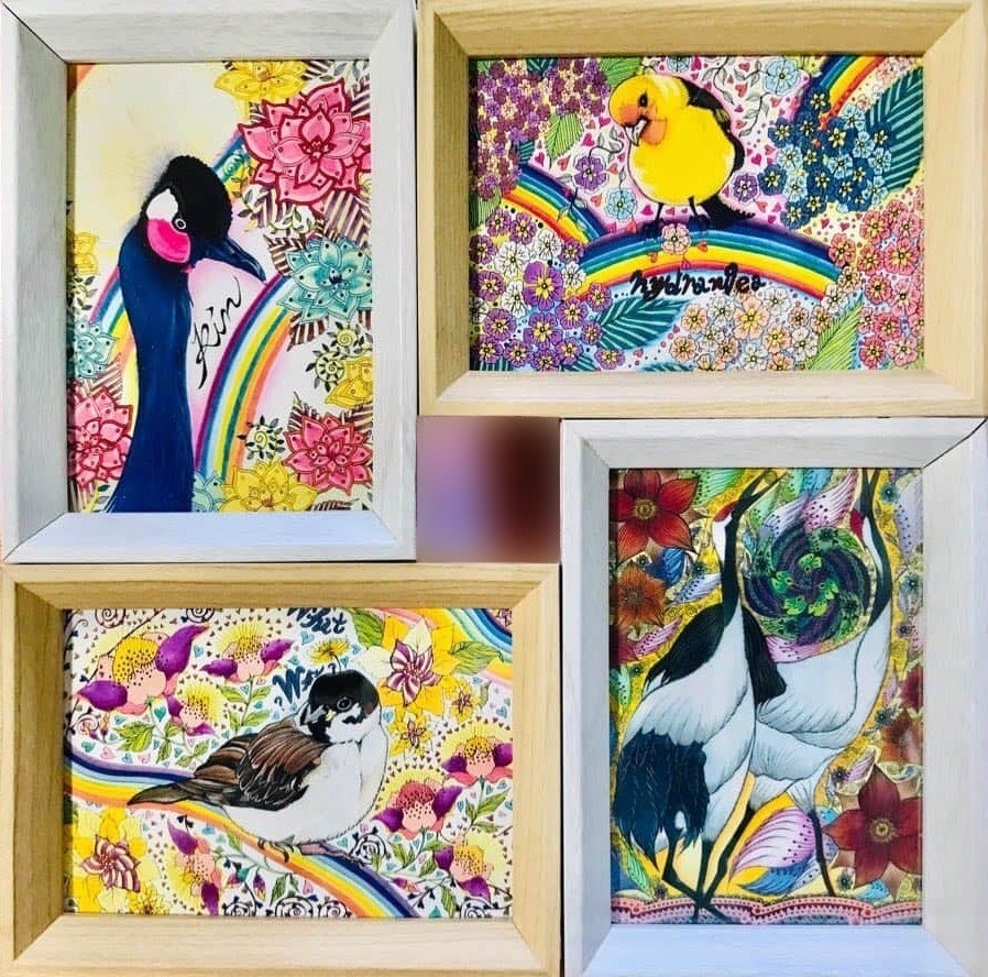 孔雀、キビタキ、鶴、雀の4種類の鳥さんの絵を写真L版sizeにしたものを、コンビネーションした作品になります。
