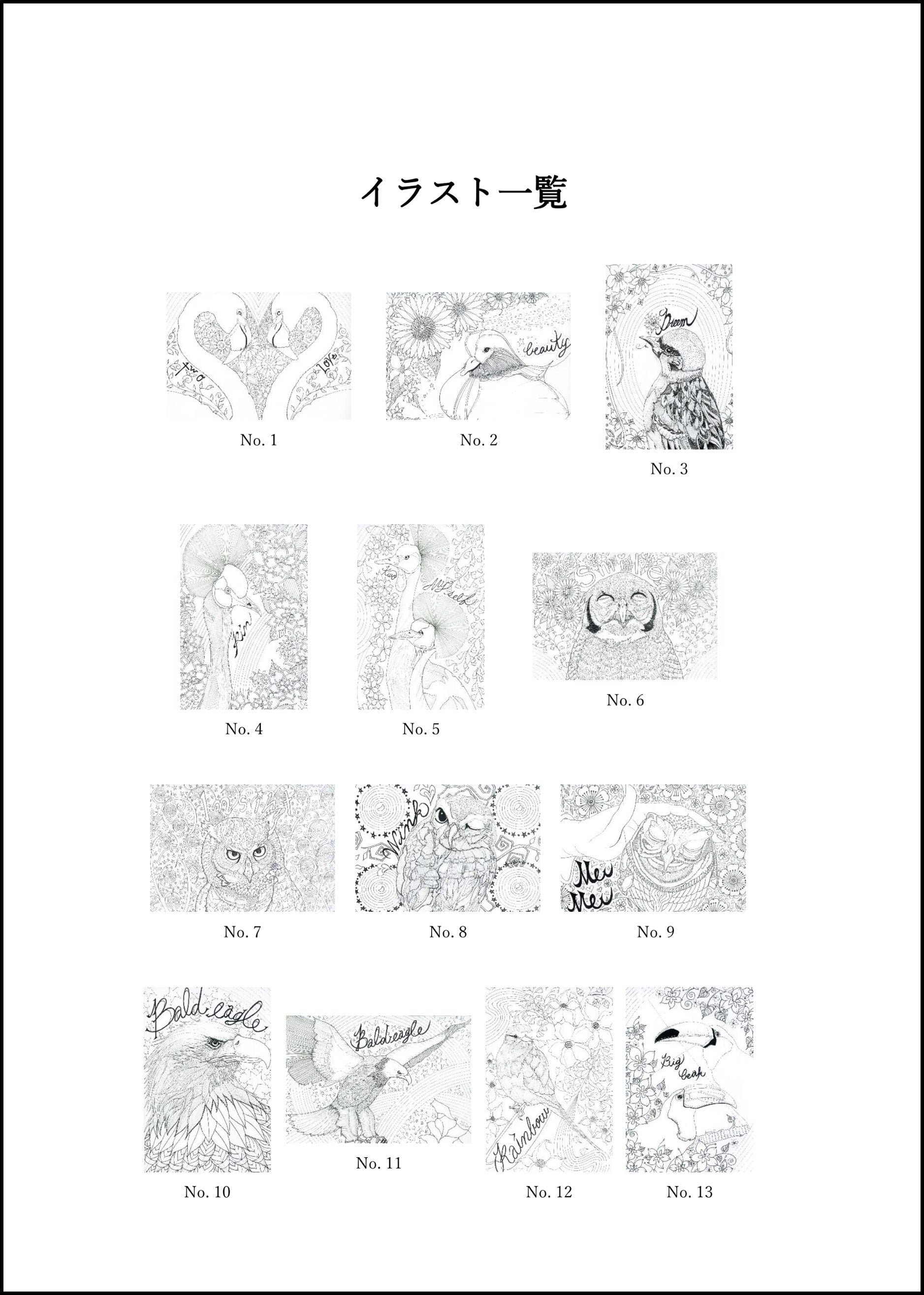 こちらは、大型な鳥さん(白頭鷲、梟、フラミンゴ など)をメインに13ページにまとめて綴った塗り絵になります♡