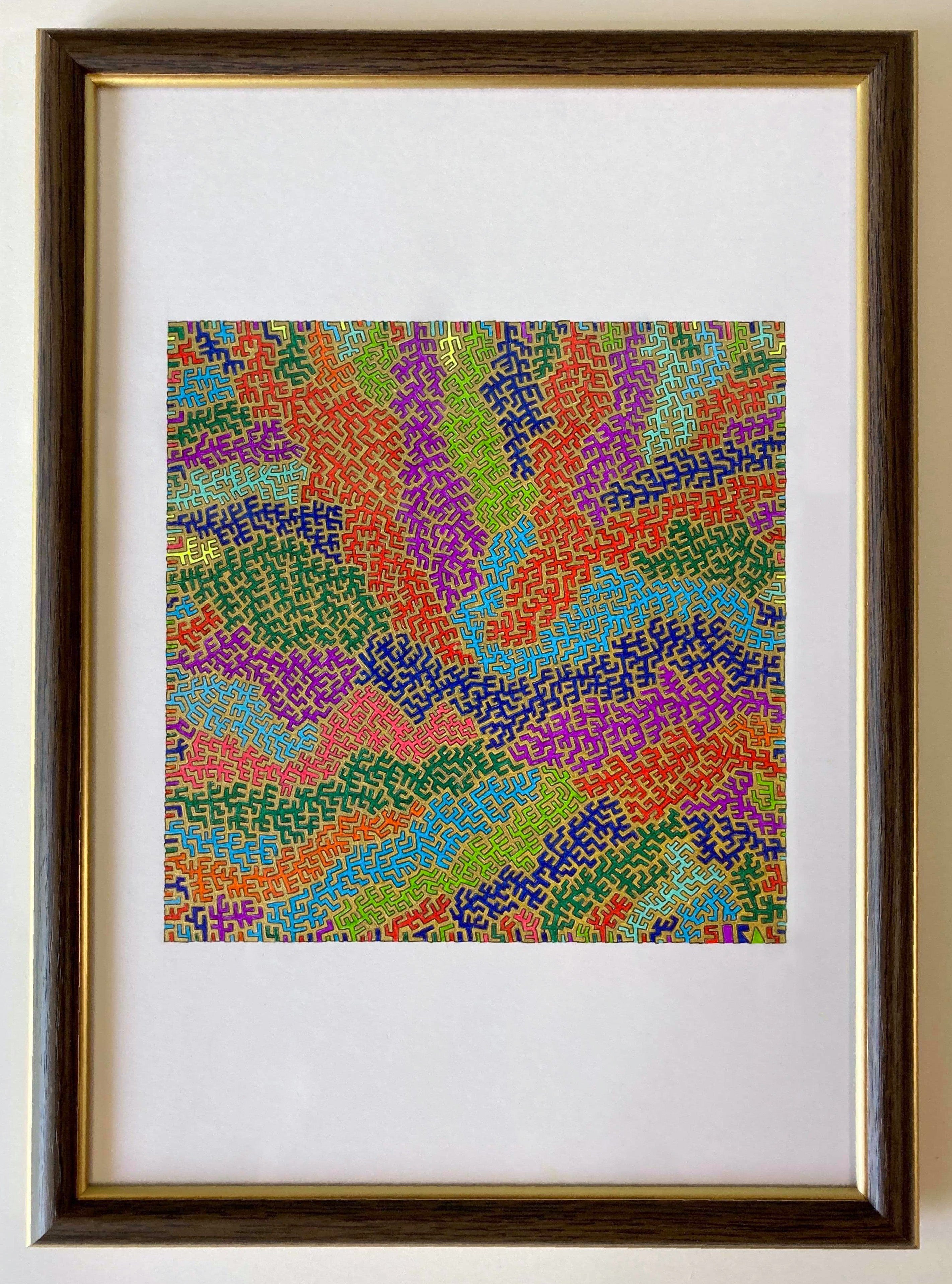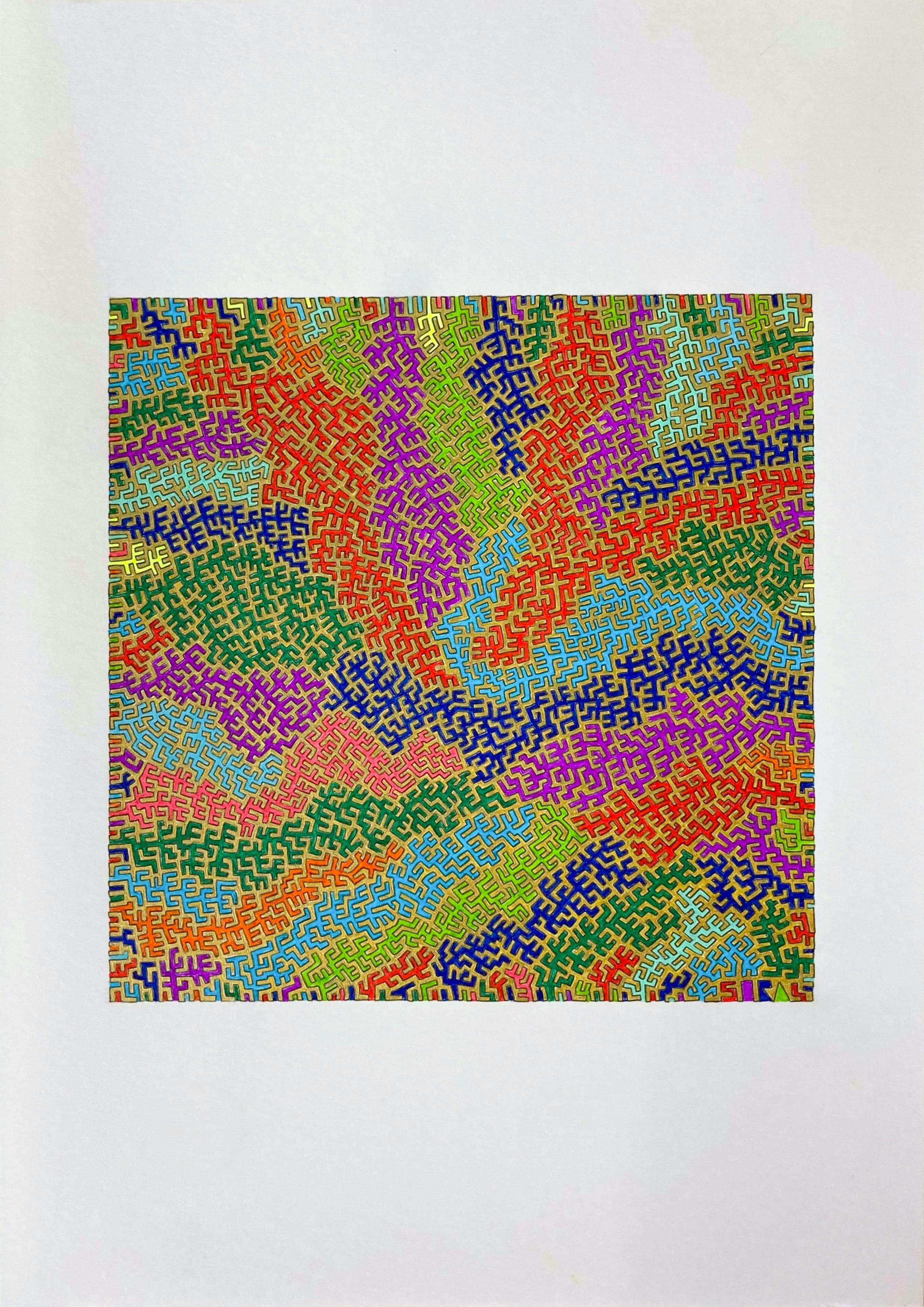 この作品は0.3㎜のシャープペンシルを使用して、始まりと終わりの無い一本の線で描き、様々な色のボールペンで塗りました。