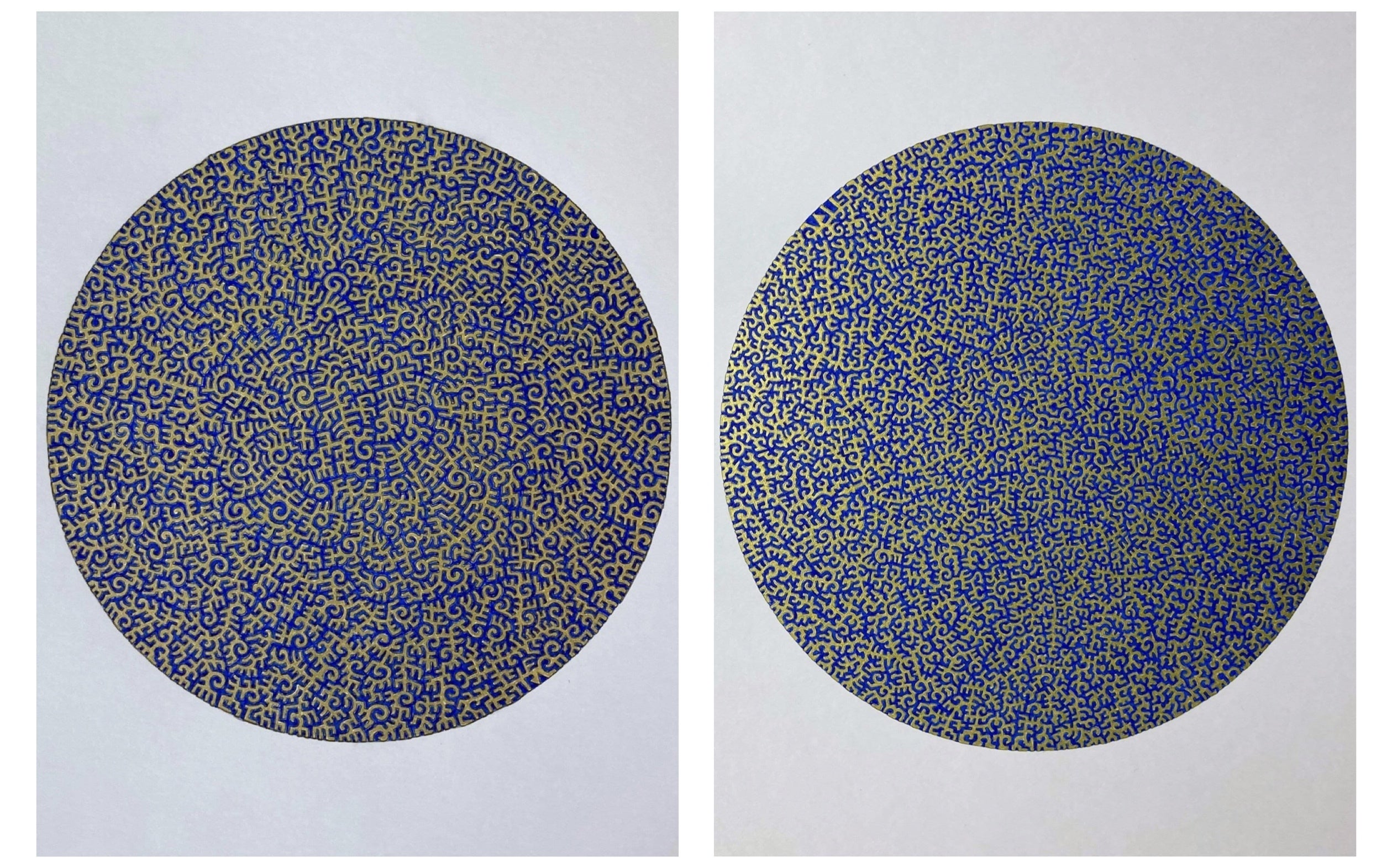 この作品は0.3㎜のシャープペンシルを使用して、始まりと終わりの無い一本の線で描き、コバルトブルーと金色のボールペンで塗りました。