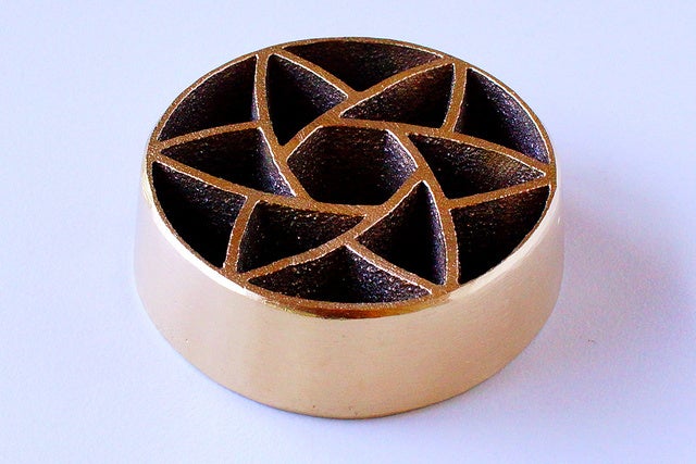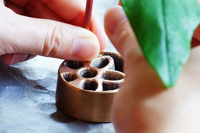 木型に紋様を彫りこみ、その上型/下型に砂を込めて製品を型取り。銅合金は約1200℃で溶解し、しっかりと不純物を取り除き、日本工業規格に準じたきれいな湯(金属)に精錬して砂型に流し込みます。