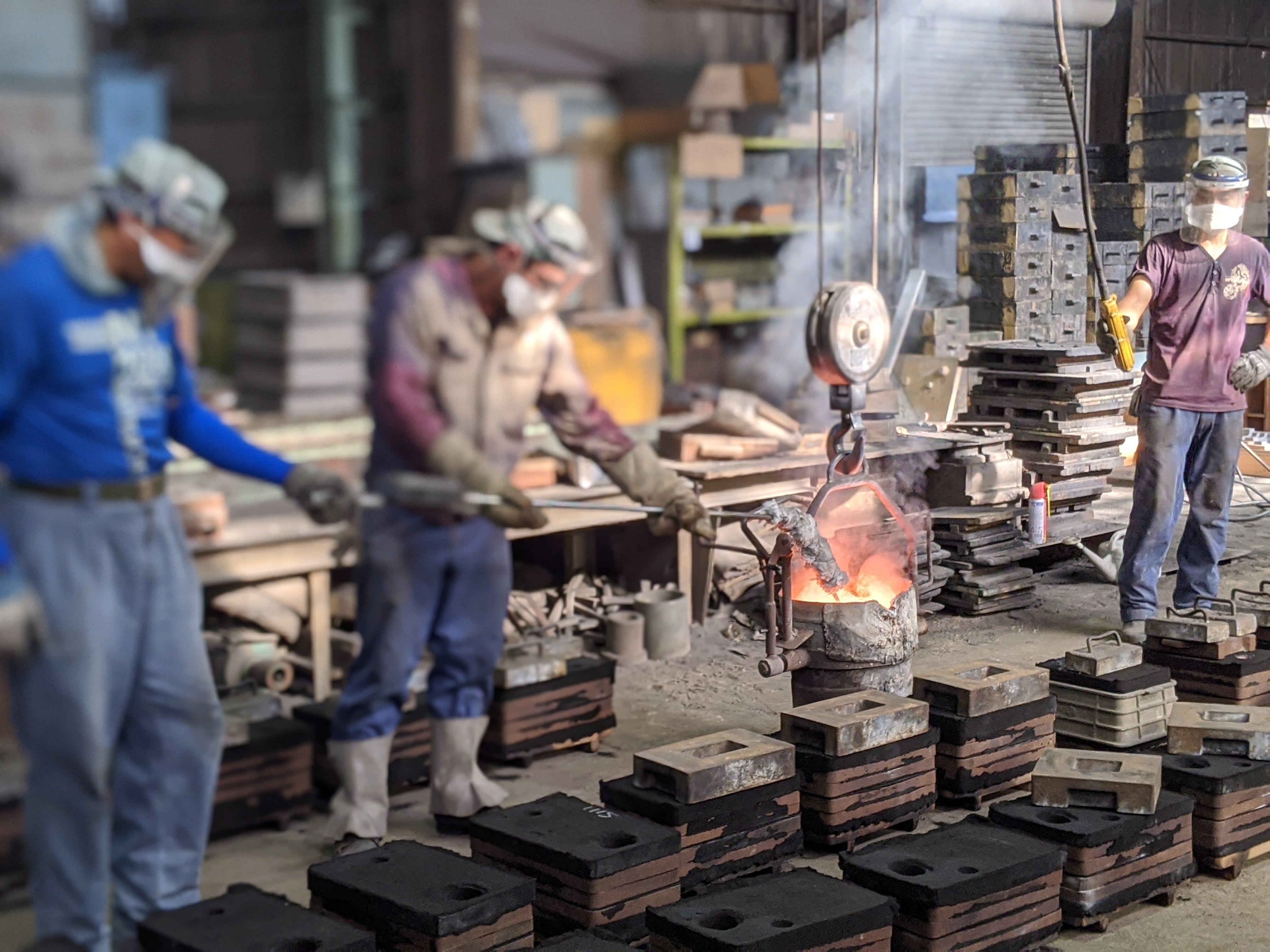 鋳造工場は真夏は60℃近くなりますが、少し暑さが和らいだものの、毎日職人は銅合金の1,200℃の溶解作業に奮闘をしております。