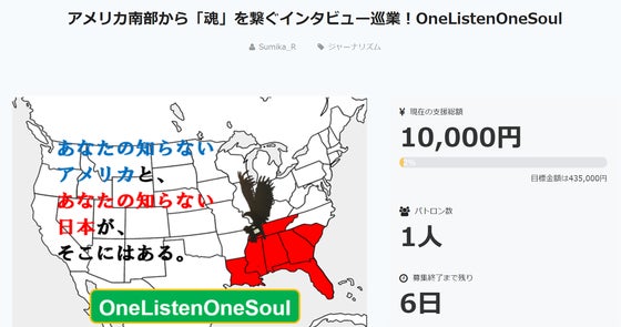 2017/06/24 18:18どうも、こんにちはスミカ(Rick)です。 本プロジェクトのインタビュー記事を掲載する予定のブログ「『生きると決めた日々。Feat.USM』」に来月からスタートする「ディープサウス日本人編」に関する 実施要項・出演ゲストの予定 このプロジェクトを行う詳しい理由や経緯 インタビュー記事(~今年5月収録分、第7回まで) 以下の内容の記事をアップしています。ぜひ、目を通していただければ幸いです。 ↓↓以下のリンクからそれぞれの記事に飛べます↓↓ 来月実施のインタビュー巡業「ディープサウス日本人編」、ここまでの進展状況をお知らせします で、なんでインタビューなんかしてんの?OneListenOneSoulとかいうアホ企画を止めない理由 【OneListenOneSoul#6】「働く」ってなんだろう?国境を越えたからこそ気付くコト—Yoko Nixonさん【前編】 そして、来月に実施する本プロジェクト「OneListenOneSoul ~ディープサウス日本人編~」のクラウドファンディング募集期間が残り5日となりました。中々このページにおいて企画の中身が不透明であった中、これまで集めた金額は目標の2%となってしまっているのが現状です。 ですが、ここにきてようやく「このプロジェクトはこのように行われます!」という全体像をようやく完成させる事が出来ました。まだ出演ゲストの人数が14人にとどまっていたりと交渉は未完成ですが、MLB球団トレーナーや寿司職人・鍼灸師からふつうの主婦の方まで、日本人が知らない方のアメリカであるディープサウスという地域において「日本人を探してインタビューする」というプロジェクトをもうすぐ実施できること、そして皆さんにそれらの記事を読んでいただけることを非常に楽しみにしております。 では最後に。 まずは上の方に貼らせていただいた各リンクから、私がこのプロジェクトにかける「魂」をご覧ください。そして、もし本企画にご興味を持っていただければプロジェクトのご拡散・およびご協力をお願いいたします。 スミカ(Rick)⇒プロフィールはこちら⇐⇒ブログ「『生きる』と決めた日々。Feat.USM」はこちらから⇐ もっと見る