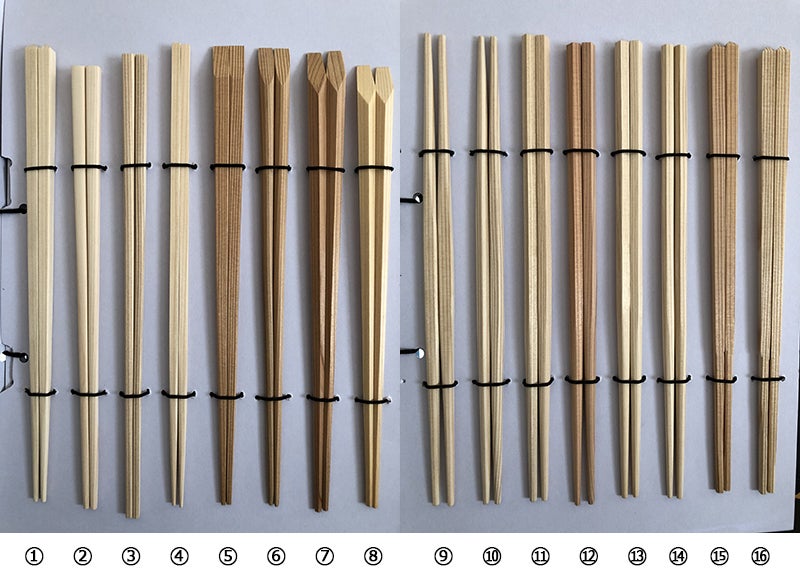 下の写真は、「森の名手・名人」(*)及び「信州の名工」(**)の2つの賞をともに受賞した工房「木下製箸所」制作の木製お箸のラインナップです。 お好きなお箸をお選びください。