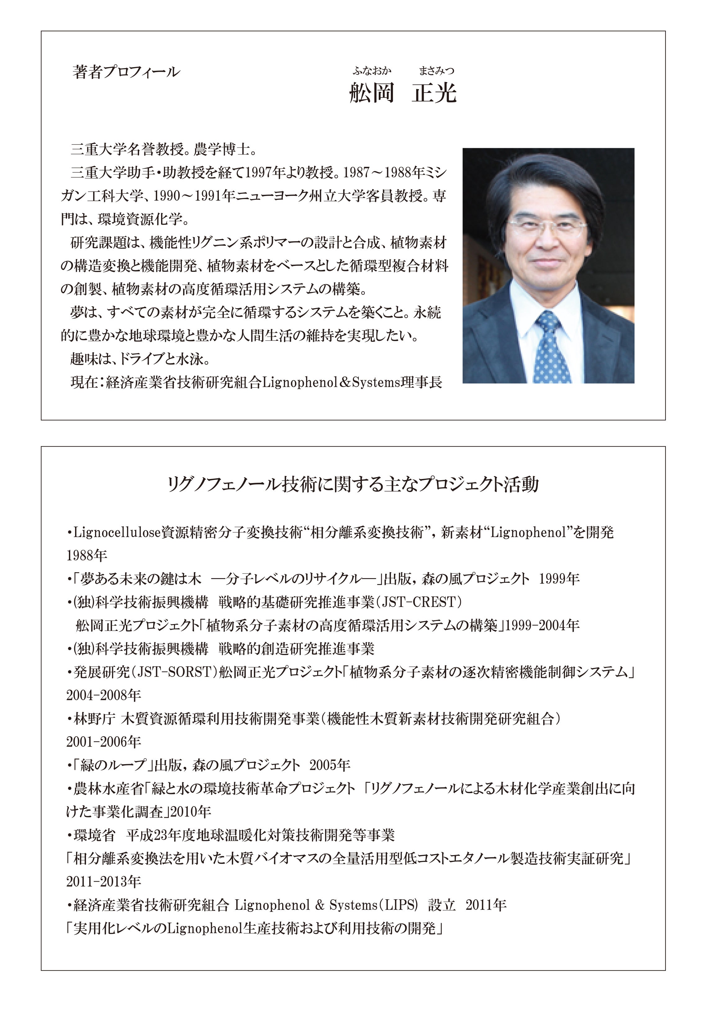 この本は、あの樹齢数千年の屋久杉の例を挙げるまでも無く、樹木が驚異的な耐久性を保っていられるのは、樹木の細胞壁の中に「リグニン」という高分子の物質があること。そしてそのリグニンは、地球上で生合成される有機物質としては最大の資源であるにもかかわらず、未だにそれを世界中で有効活用できる状態になっていないこと。それが現在、著者の研究開発によって、このリグニンを「リグノフェノール」という新素材に変換し、その活用により、例えば、現行のプラスチックの原料を石油から木材におき替えることもできるようになるなど、分子レベルでのリサイクルが可能になっていることを教えてくれます。