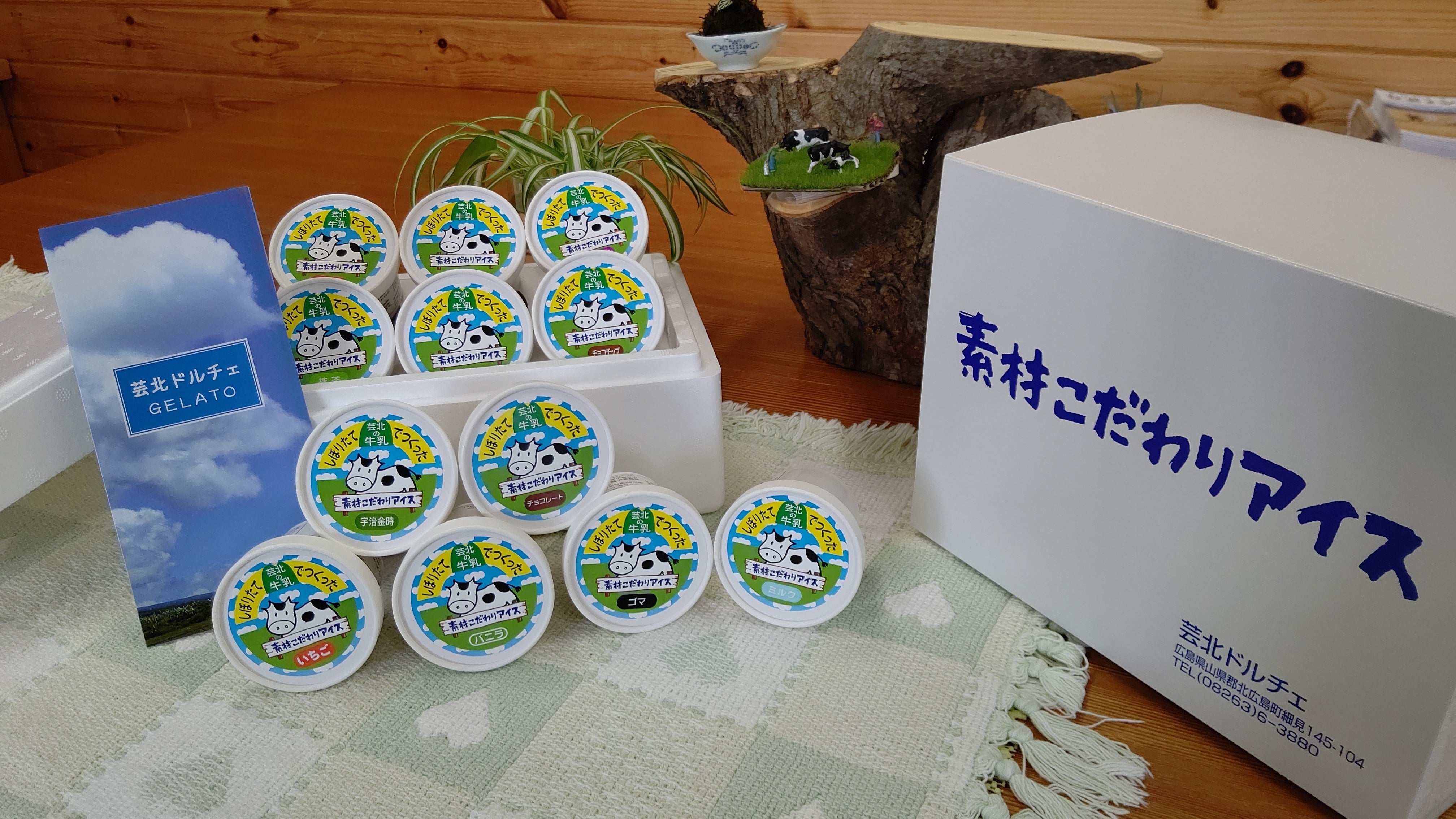 新鮮な搾りたての牛乳を使い、芸北ミルク、芸北りんご、大朝ブルーベリーヨーグルト、豊平いちご、 瀬戸内レモン等地元の食材をふんだんに使った様々なジェラートを季節によってお楽しみいただけます。また変わったものとして芸北ほうれん草や芸北かぼちゃ、芸北やきいも等当店でしか味わえないお味も用意しております。