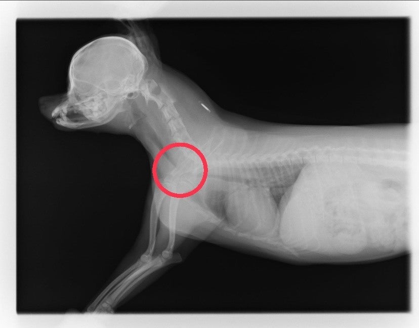 くーちゃんの病状は「グレード3.5」で、下の写真のとおり気道が潰れ、呼吸がうまくできない状況にあります。非常に苦しく、特に夜から明け方にかけて、ゼェゼェ‥と眠れない日も少なくありません。