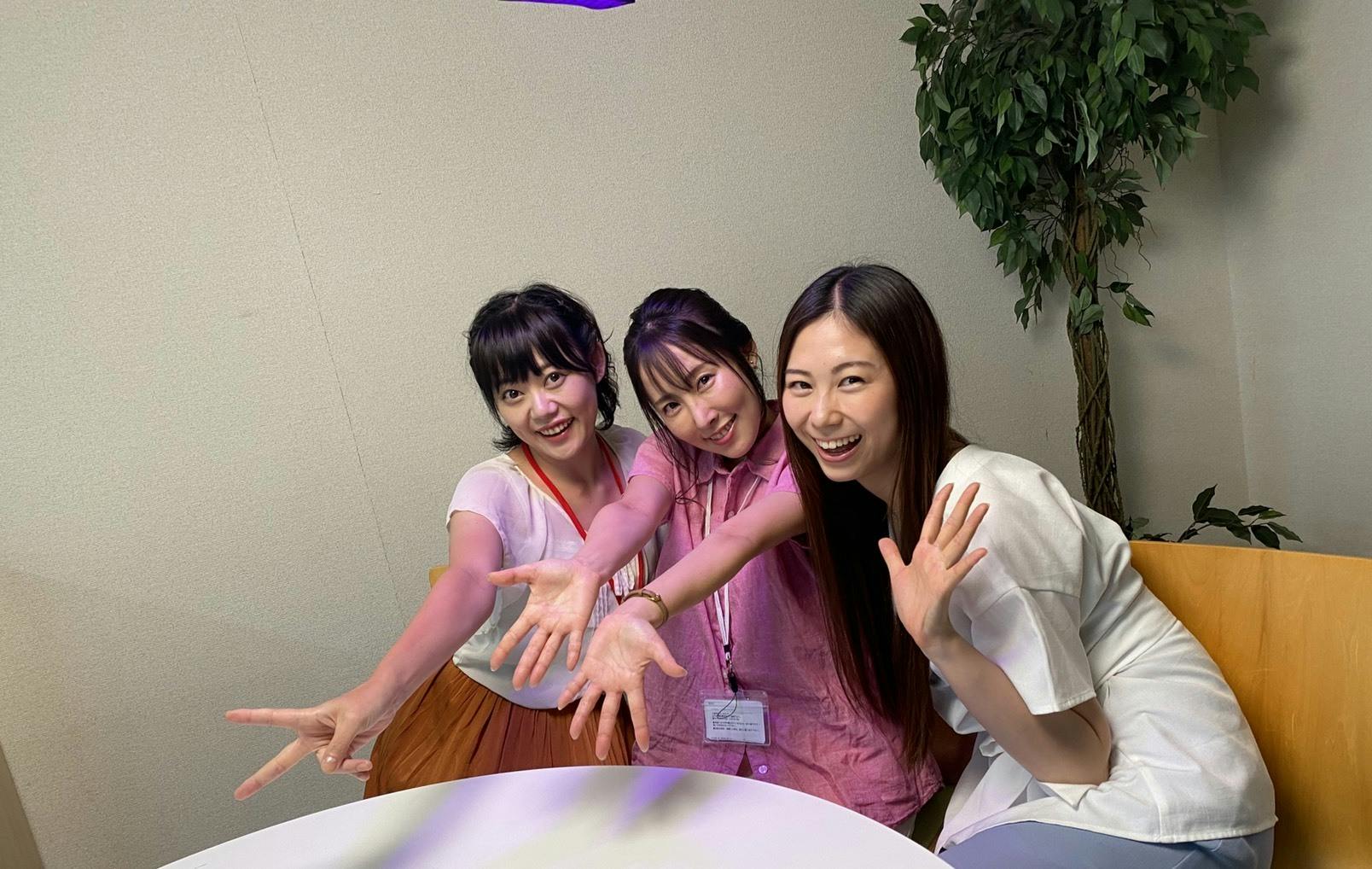 オフィスシーンの撮影終わり。女性演者3人が記念撮影してました。こういう華やかさが撮影現場を明るくしてくれるのです。