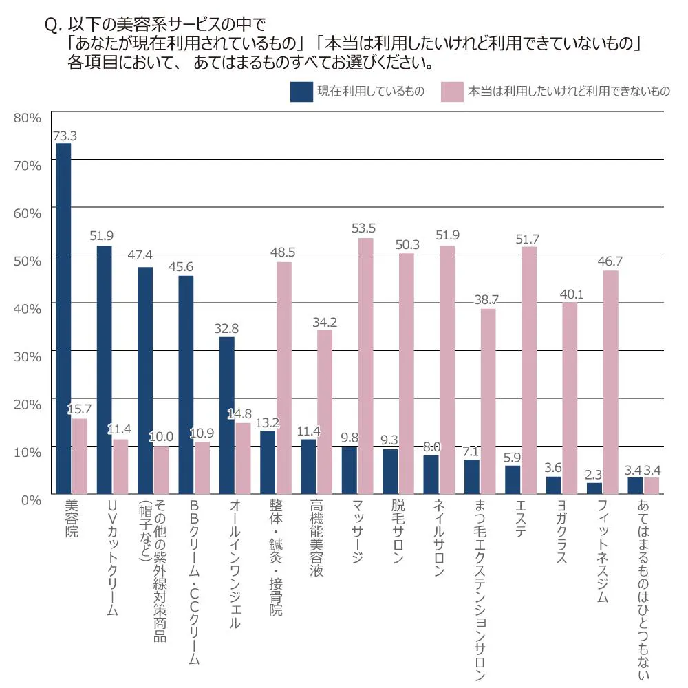 美容系のサービスの中で本当は利用したいけれど利用できていないものというものには、脱毛サロンやネイルサロン、エステ、ヨガ、フィットネスなど多岐にわたることもわかります。
