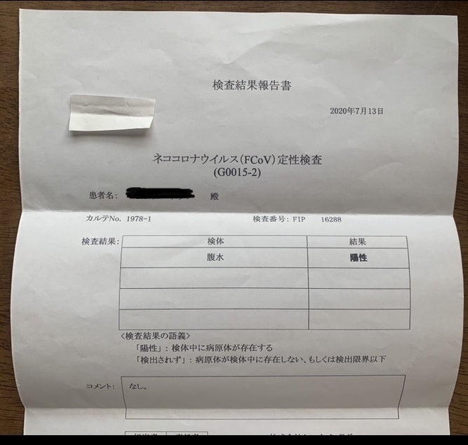 近所の病院での検査結果FIP は陽性と電話で知らされました。詳しくは病院に来てくださいとの事で、息子と病院に着きました。