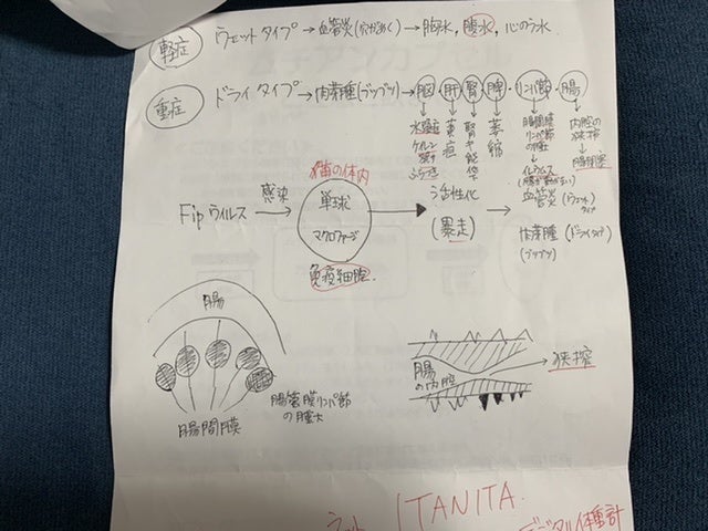 ここで初めて猫伝染性腹膜炎かも知れないと言われました。少しお腹が膨らんでいるのは便秘ではなく腹水でした。私は初めてその病名を聞きました。先生が言うには、このFIP と言う病気は進行が早く数日〜2か月で亡くなる怖い怖い病気ですとの事でした。その後の先生の話を涙が流れるのを必死にこらえて聞いていました。