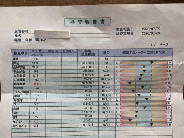 7月9日 朝から病院に連れて行きました。血液検査とエコーの結果