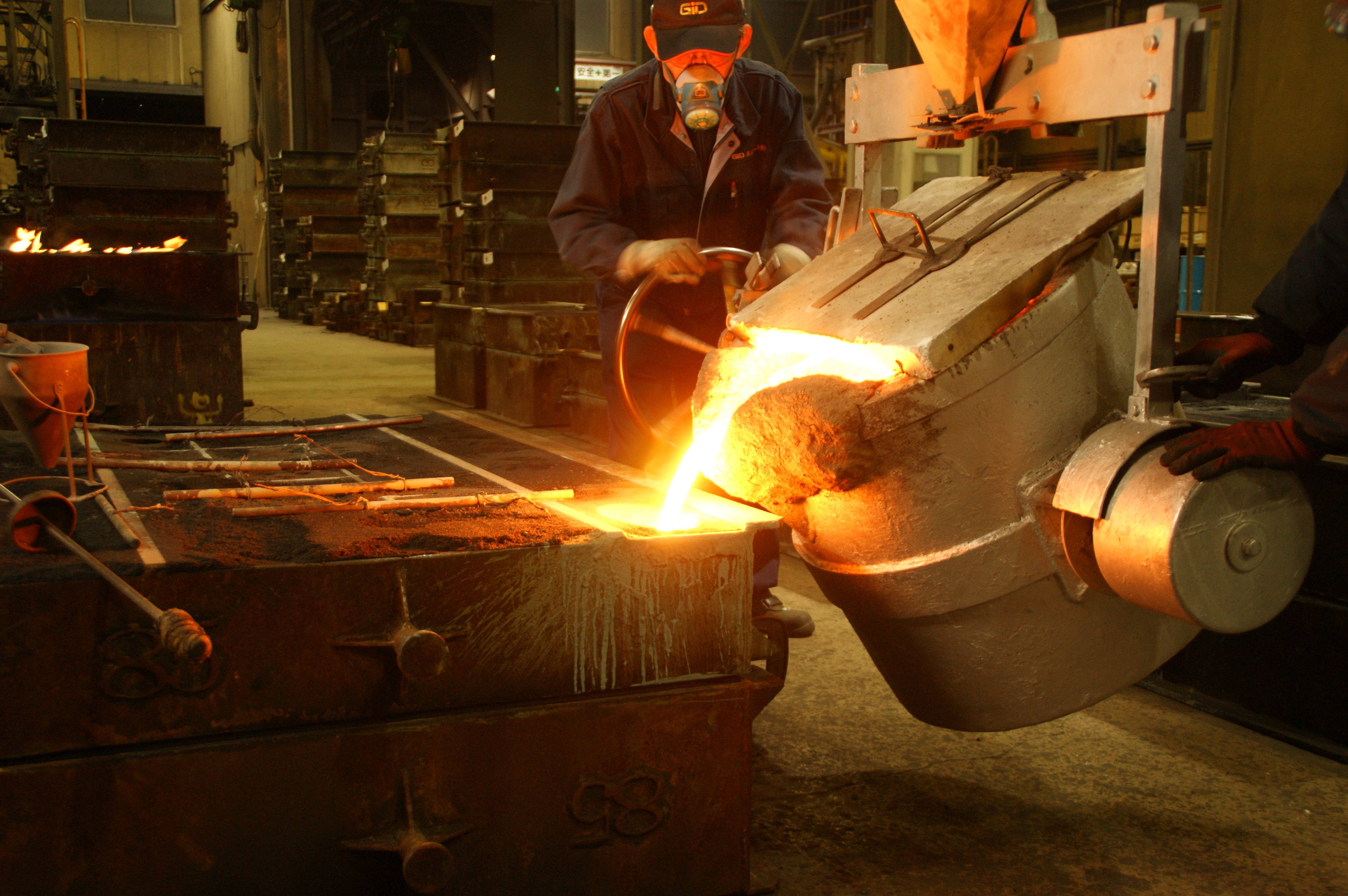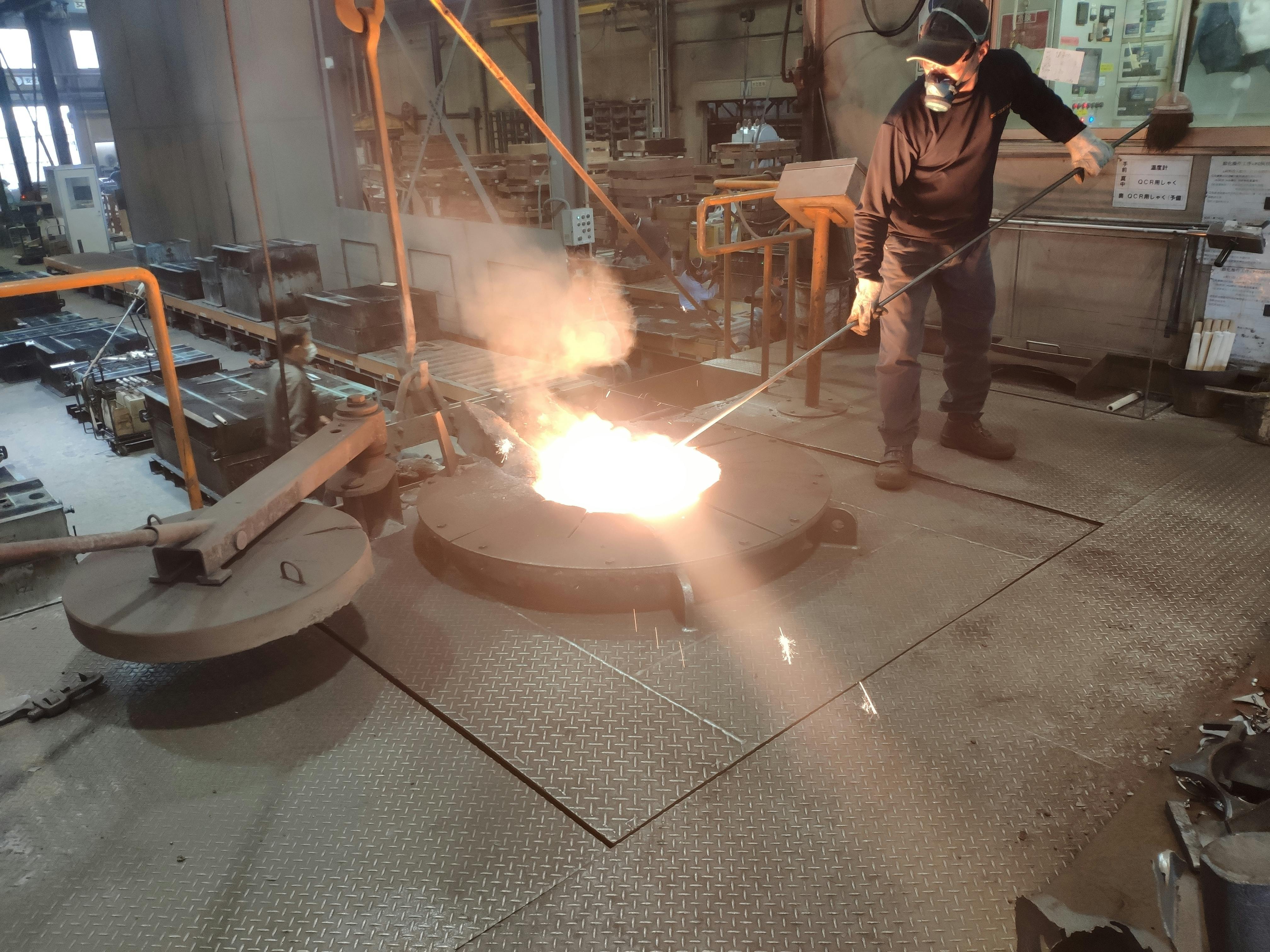 溶かした鉄を型に流し込む「注湯」の様子です