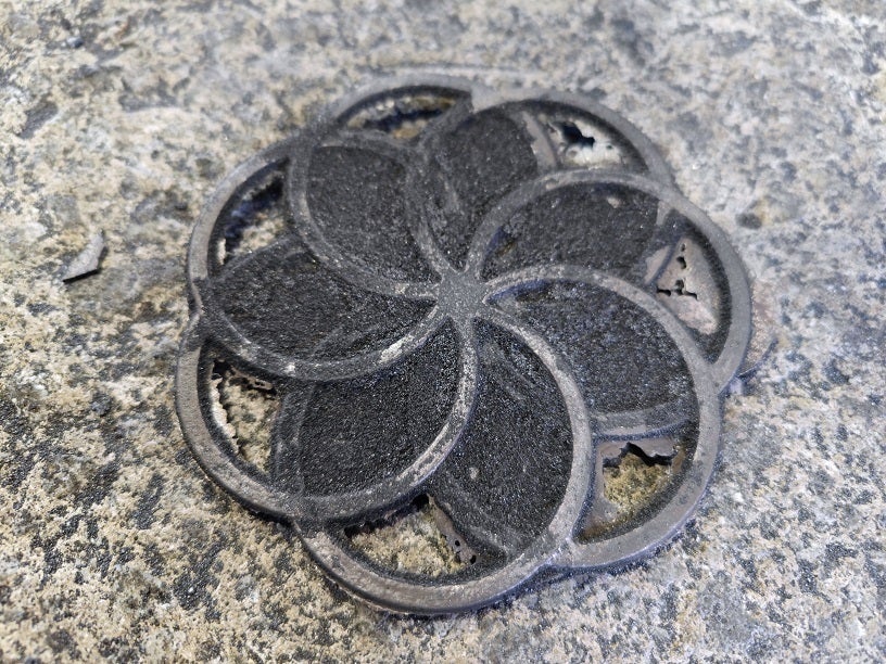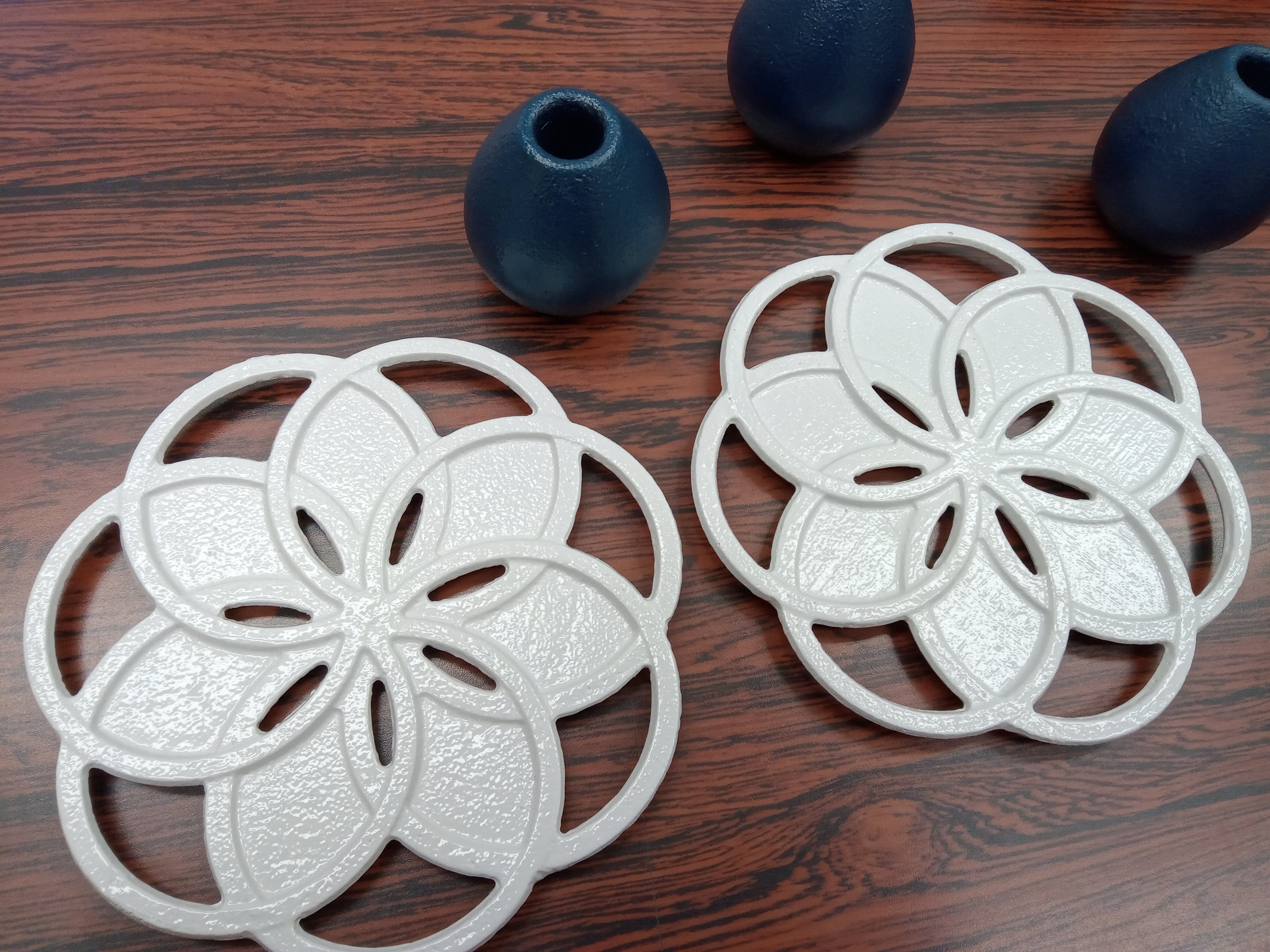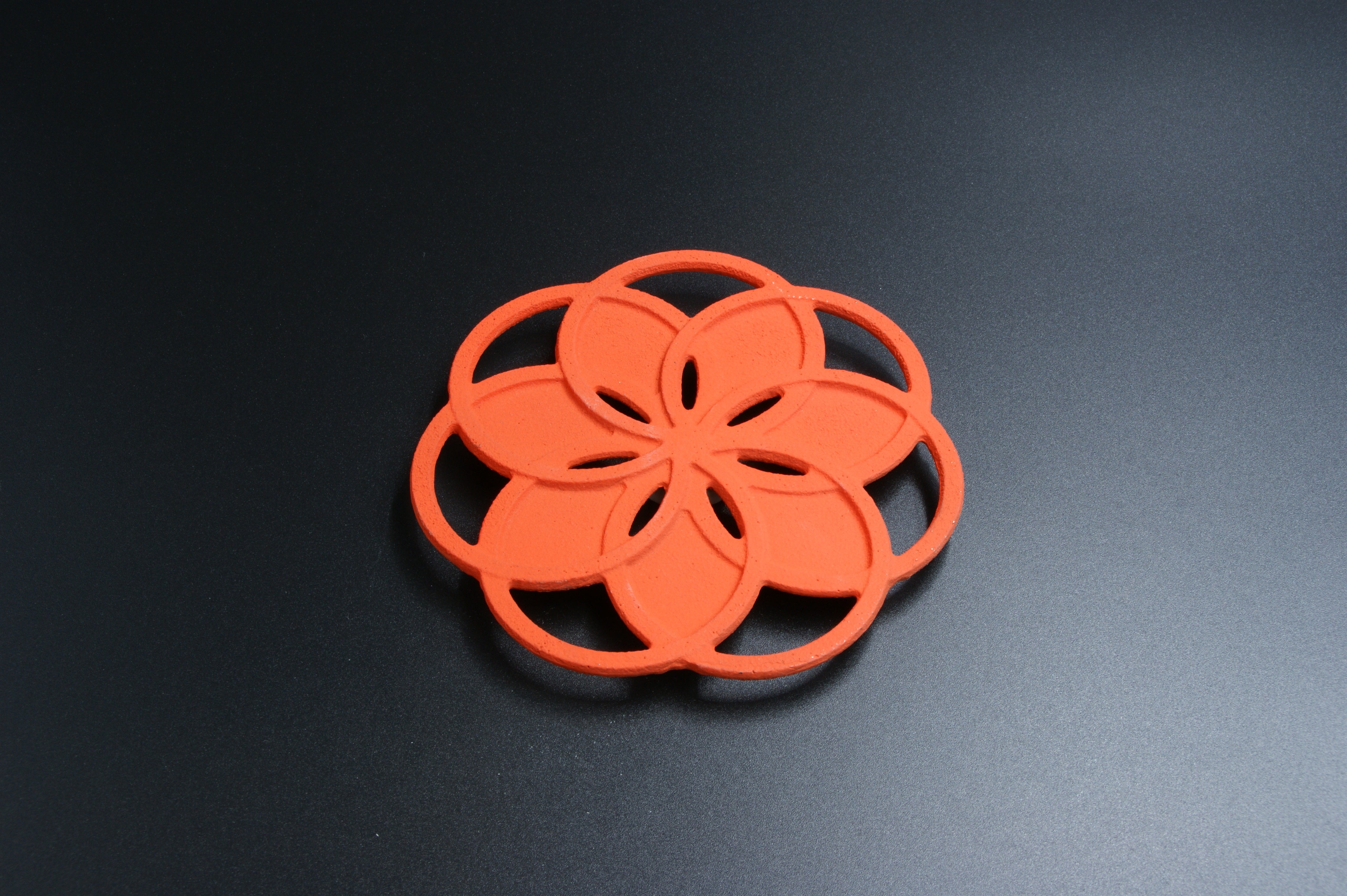 幾何学模様が特徴的な鍋敷きです。鋳物の特性である熱伝導性を活かした製品で、上に置くものの熱を机に伝えません。