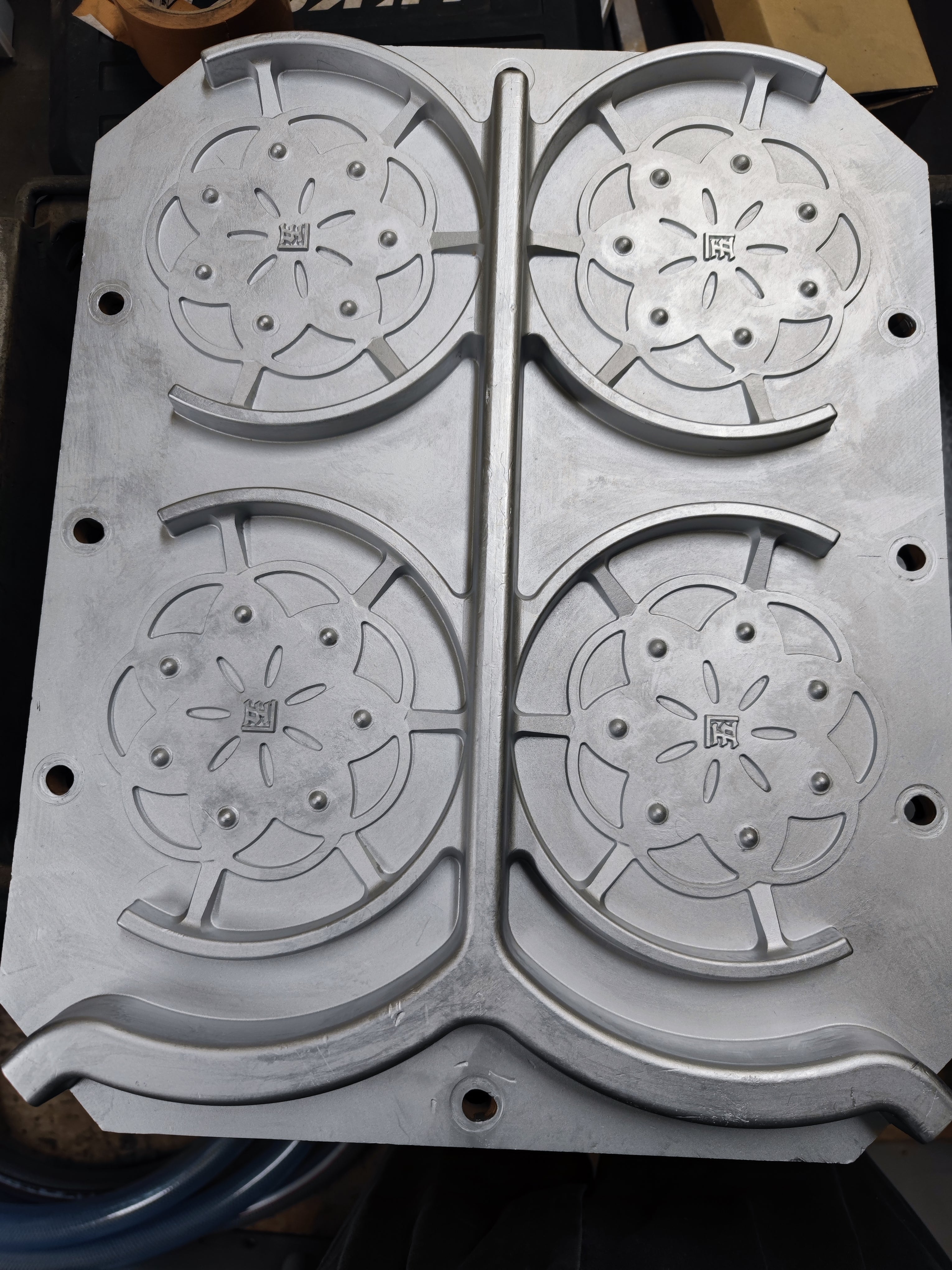 平素よりご理解ご協力いただき誠にありがとうございます。木型が出来上がって参りました。こちらは鍋敷きの木型となっております。お客様の声を反映し、接地する足を大きくして安定感を向上させています。ご覧いただくと銀色に見えますが、こちらは「造型」(砂を型に詰める作業)を行う際に砂と木型がくっつかないように塗布する離型剤というものです。うどんをこねる時の打ち粉と同じです。また、製品となる部分以外に枝のように回り込んでいるものがありますが、こちらは溶けた鉄が流れ込むルートになっております。太い経路を「湯道」、製品に入る直前の細い経路を「堰」(せき)と言います。製品の大きさや複雑さによって、湯道や堰のルート、数が異なってきます。これから、製品が製造されていきます。もう少し楽しみにお待ちいただければ幸いです。