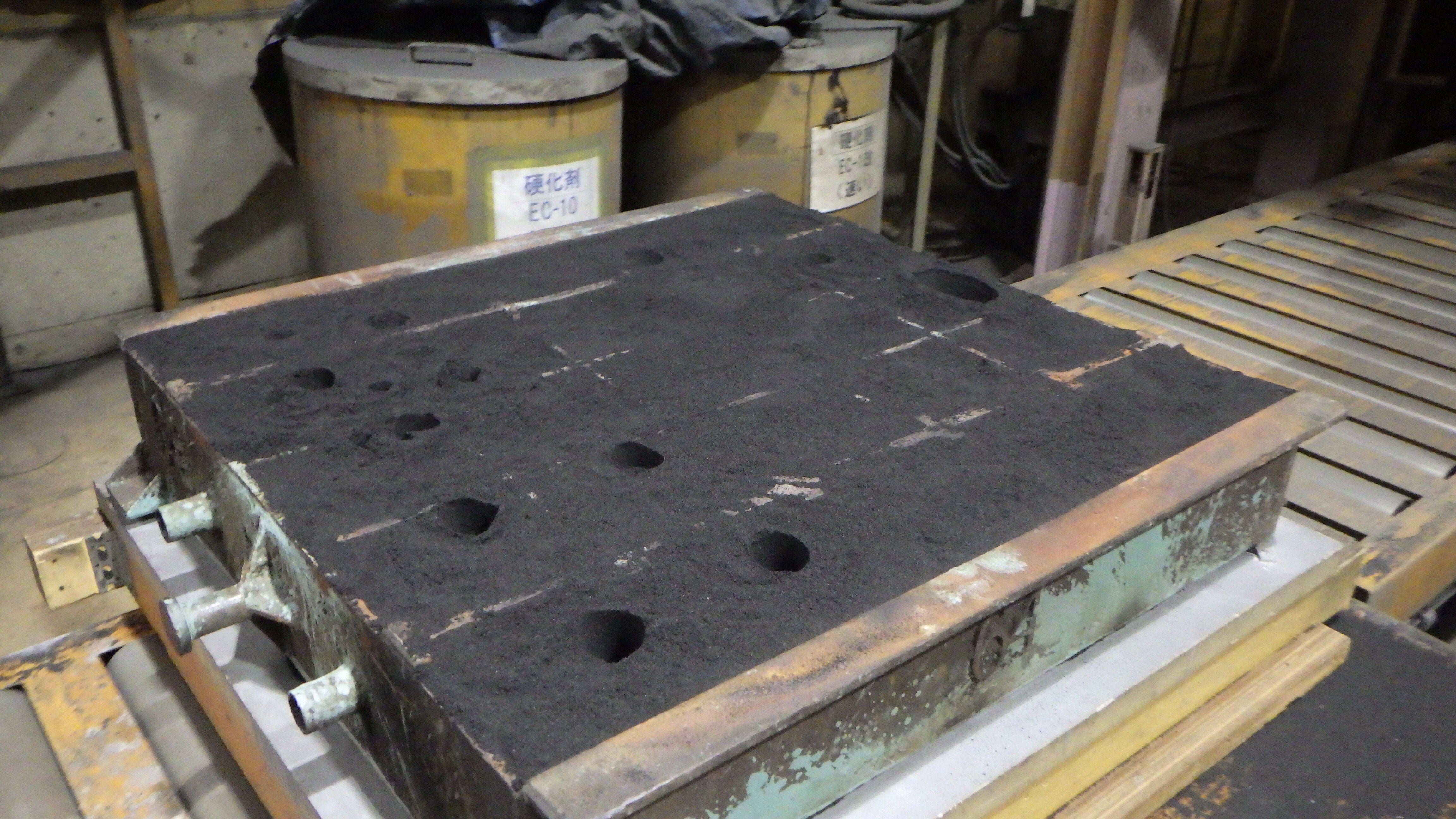 こちらが出来上がった鋳型の写真です。黒く見える部分はすべて「砂」でできています。川や海の砂に特別な薬剤を混ぜることで一定時間が経過すると硬化する性質を持っています。こちらが砂を投入する前の木型です。リターン品としてお送りする予定の鉄皿の木型が載せられています。ここに時間経過とともに硬化する砂を投入することで、鋳型を製造しています。この工程を「造型」と言います。熟練の技と、現代のテクノロジーが融合され、製品を形作る一番キモになる部分がこの工程です。次の活動報告では、造型が終わった後の「塗型」工程をご紹介します!