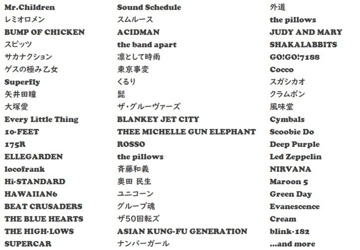 約60のバンド(最下部に列挙)を200〜300曲程度コピー。