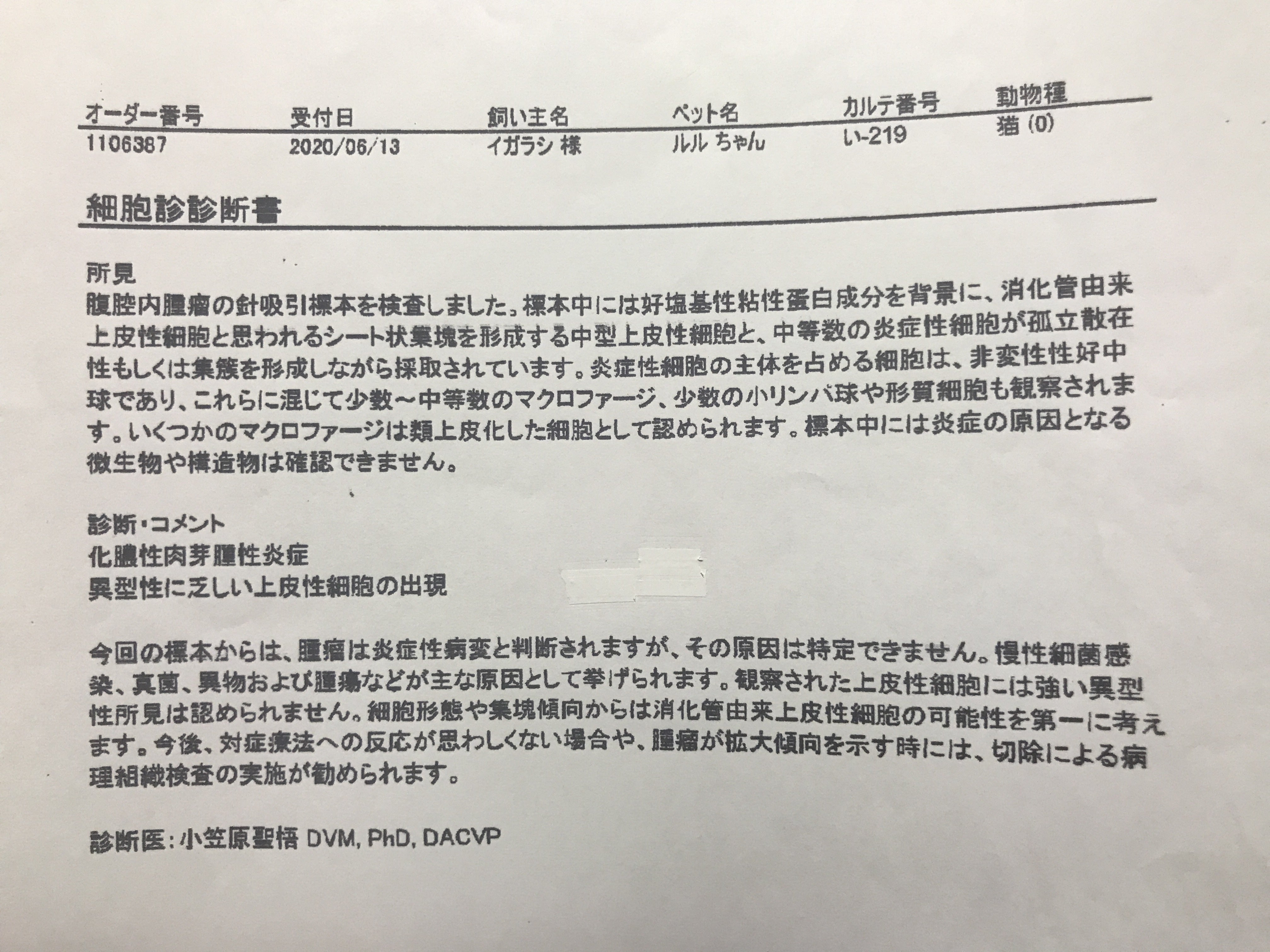 朝、迎えに行くと前に出していた肉芽腫のようなものの細胞の検査結果が出たので聞きに行きました。