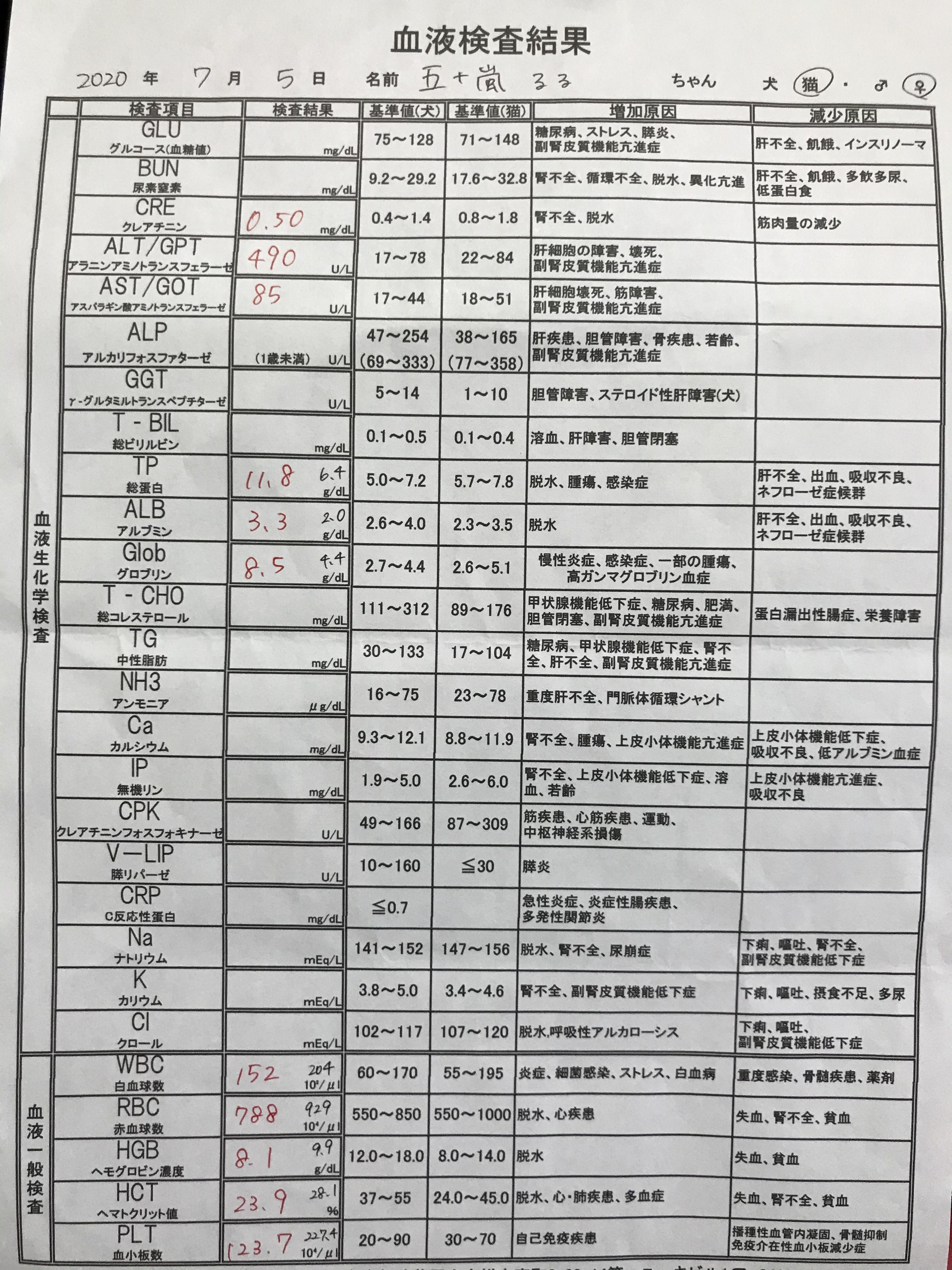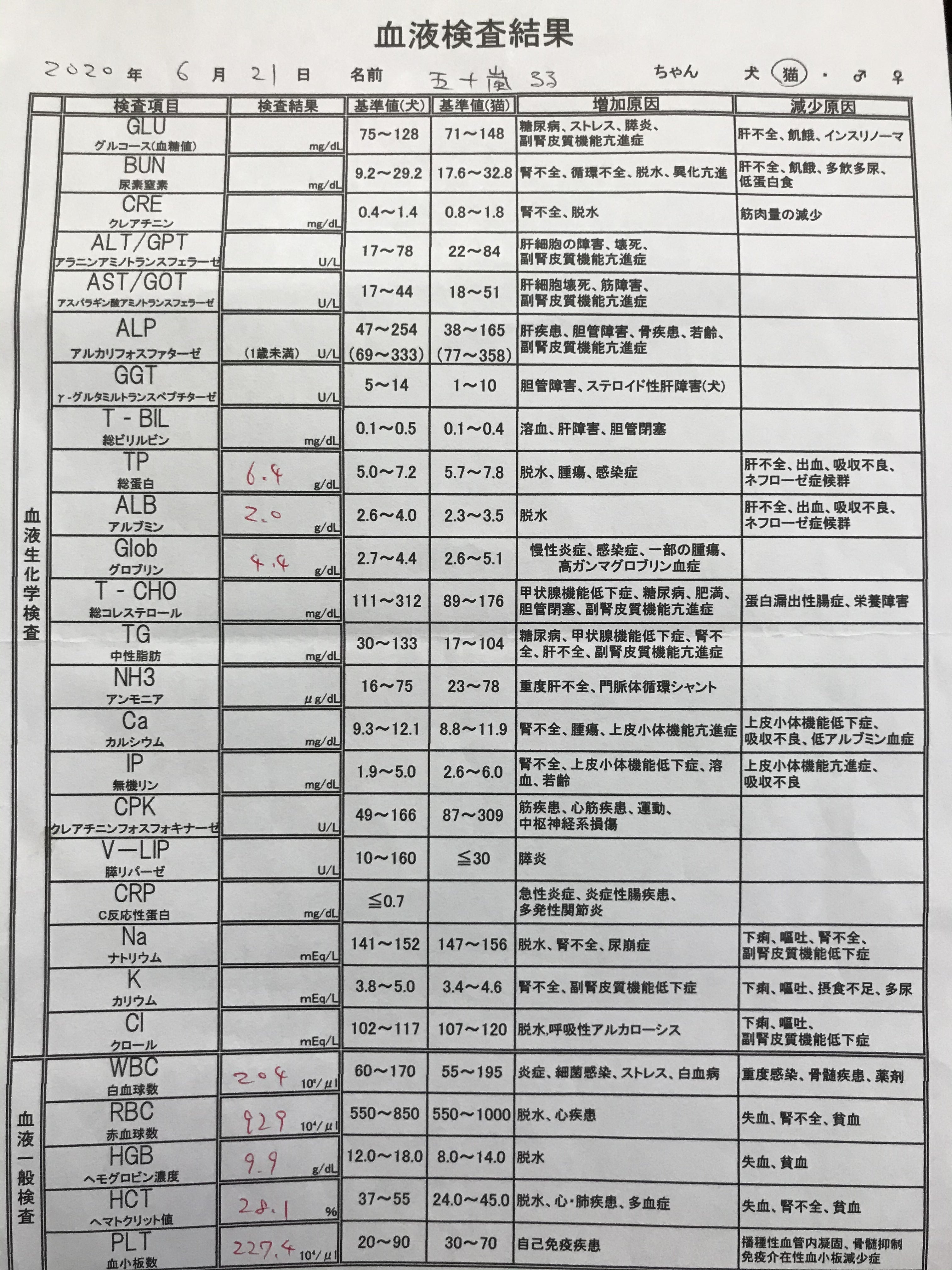 A/G比がまだ0.41で基準値の0.6にはいってません。そして、タンパクの数値の下がりが緩やかすぎるのでこのままあと約6週で基準値内にもっていかなければなりません。