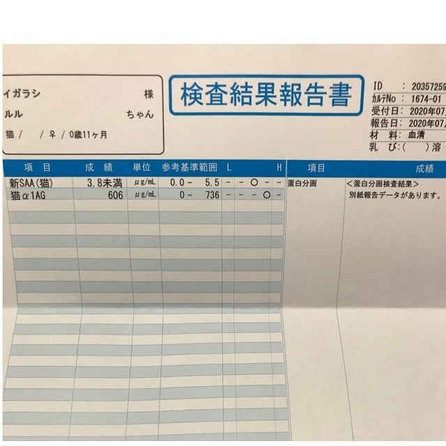 2020/12/19 13:44大変遅くなりましたが、13日に協力病院へ最終検査に行ってきました。結果としては普通の猫ちゃんと同じ数値なので【寛解】の言葉をもらいました!AG比は0.8です!!ただ、肝臓の数値はサプリ飲んで少し下がったのでこれからも継続します。今度、検査はかかりつけの病院でお願いしますとのことなので3ヶ月後か半年後に!(近くで探します。。)そこまで何もなかったら本当に安心できるかなあって自分的に思います。あと肝臓の数値も改善目指して(^^)--------------------------------ざっと振り返り6月頭にFIPの疑いと言われた時は何故か強気でした。ピンと来てなかったからでしょうか。帰ってからネットで症状を検索してもしても出てくるのはやっぱりFIP。。悔しい、、憎い。。どうか明日も生きてください一緒にいさせてくださいと毎日願いながらるるの横で寝ました。でもまた行動しなかったらダメだ!るるは死なせない!と、どうにか助ける方法を探しやっと辿り着いたお薬を84日投薬することで希望が見えました。。結局、かかりつけの病院では誤診され協力病院で確定を受けました。そこから投薬スタートして日に日に元気になり酷かった腹水もみるみる抜けて遊ぶように。投薬84日も試行錯誤でちゅーるに中身出して混ぜたり、そのうちバスタオルと素手で挑めるようになり毎日格闘!経過観察84日も終わり今、寛解に至ります。るるたん頑張ったね!!希望を捨てずに良かったです。るるがご飯催促してくること遊ぶこと、食べること、フミフミして寝ること、高いとこに登ること。。普通の猫の生活送れることが嬉しいです!!これまで、関わっていただいた皆様本当にありがとうございました!クラウドファンディングというひとつの挑戦も応援やご協力が無ければ達成出来なかったですし、今こうやって寛解を迎えられてないかもしれません。一緒に戦っていたFIPの猫友さんは寛解目指し頑張りましょうとやり取りしたり先輩猫ちゃんのママさんにも優しくアドバイスをもらいました。忙しいなかありがとうございます。みなさんのサポートがとても心強かったです!不安は完全には取れていないですがるるが快適に健康に過ごせるようにこれからも前を向いて成長できるように見守りたいです!!これからもよろしくお願いしますm(__)m忘れないでください✩.*˚写真は最近のるるです!おちり向けてプリっとしてる表情してました(笑) もっと見る活動報告その21