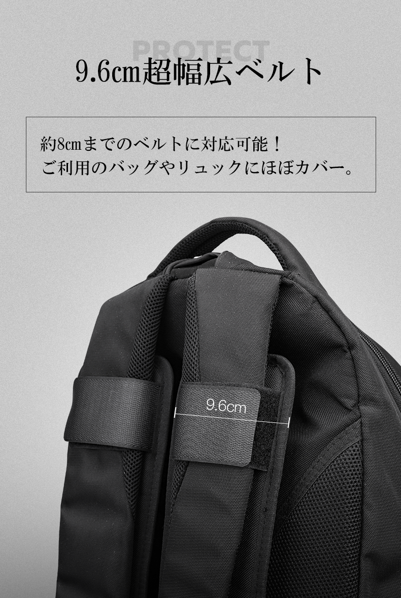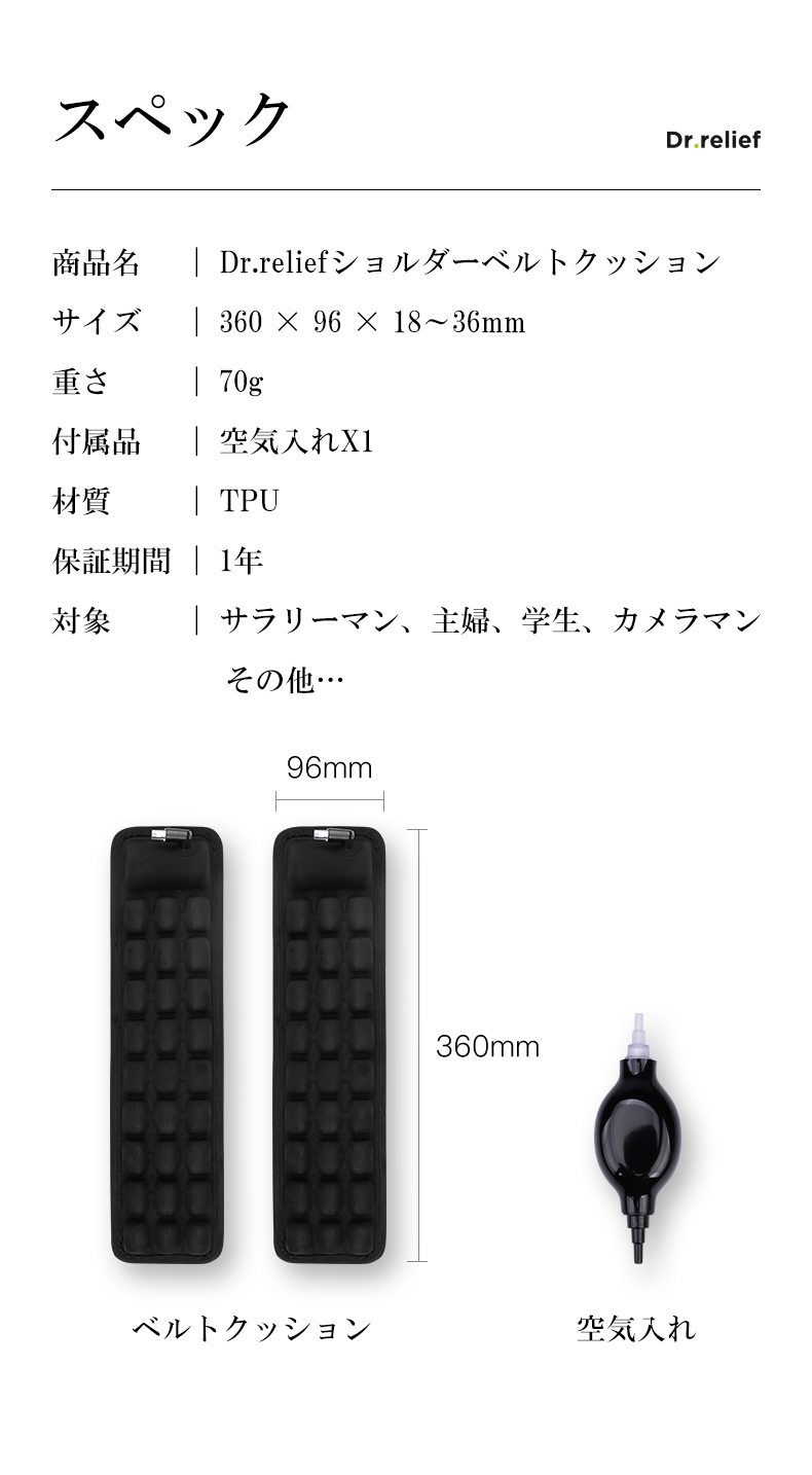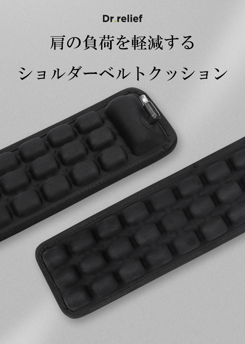 「Dr.relief」ショルダーベルトクッションは、ほとんどのショルダーバッグやバックパックなどに利用できる、
