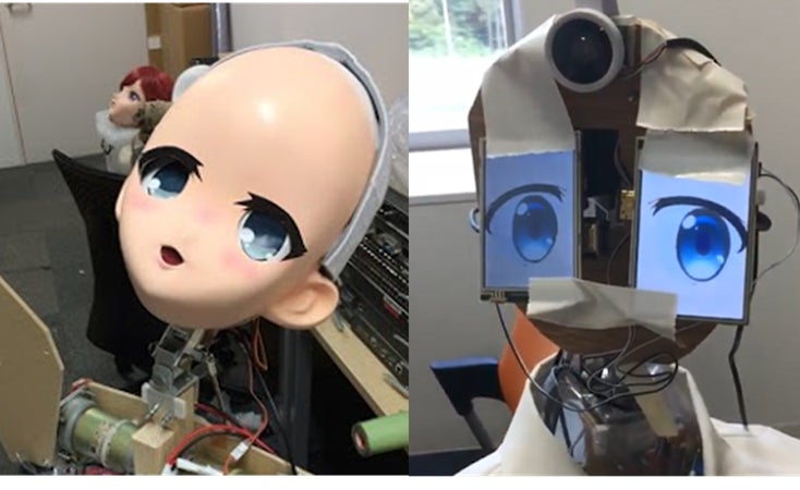 ロボットましろの特徴的なその顔は、美少女キグルミのFRP造形技術と、違和感なく液晶の瞳を駆動するロボット技術の融合で完成しました。
