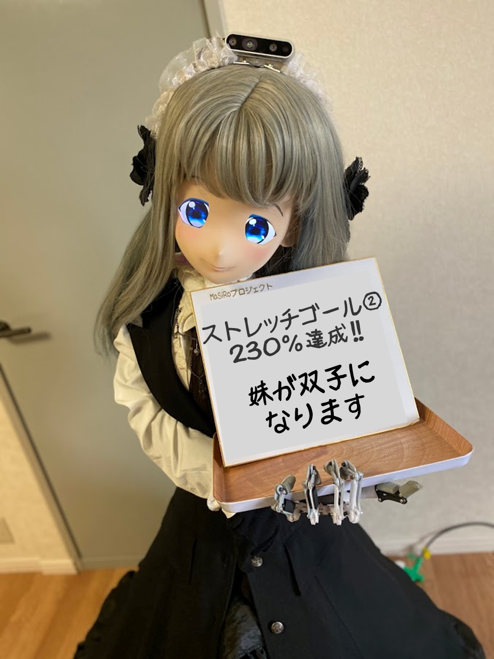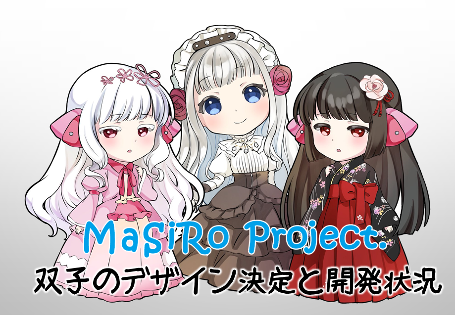 手繋ぎメイドロボットを作る 妹ロボ開発編ご支援者の皆様へ大変長らくお待たせいたしました。MaSiRoプロジェクトましろぱぱこと、A_sayです。クラウドファンディングが目標を大きく超えて終了してから、約3か月が経過致しました。現在も日々開発は進んでおり、技術的な内容は開発者Twitterにて五月雨式に活動報告しておりましたが、今回大きなトピックがございますので、こちらでのご報告とさせて頂きます。今回の大きなトピックは ・双子ロボットのデザイン決定について ・アクリルキーホルダーのデザイン変更について ・開発状況と完成予定日についてご報告させていただきます。・双子ロボットのデザイン決定について皆様のご支援のおかげでストレッチゴール②を達成して、妹ロボットの双子化が決まり、そして長らくお知らせできていなかった、双子のもう一人の妹のデザインが確定いたしました。今回開発する2人目の妹は、1人目の妹とは対照的な和装の似合う黒髪の妹を開発いたします。絵: 夕凪ショウ (Twitter @yuunagi_show) 双子そろっての洋服コーデ和服コーデや、お互いの衣服の交換などおしゃれの幅も広がり、対照的な白色と黒色のコントラストの双子と、両手で手を取り歩んで頂けるようになります。是非とも生まれてくる二人の妹達を愛して頂ければ幸いです。二人の名前も、完成後、お披露目いたしますので楽しみにお待ちください。・アクリルキーホルダーのデザイン変更について 双子化に伴いまして、クラウドファンディングのお礼品であるアクリルキーホルダーもデザインを、当初2人並びだったものを三姉妹仕様に変更させて頂きたく願います。ご了承どうぞよろしくお願いいたします。・開発状況について現在鋭意製作中である妹ロボット達ですが当初、完成予定は1月以降とさせて頂いておりました。しかし、双子化による作業量の増加と昨今の時代情勢のなかで、部品の遅配や開発メンバーの移動が制限されていること、さらに開発中に機構に設計上の問題などが生じ、改修作業が必要となって参りました。このまま突貫で開発を進めても、お披露目の際、中途半端な状態での公開となってしまうと判断し、早期の完成を楽しみにされていた皆様には大変申し訳ございませんが、双子の完成時期は、来年4~5月ごろの予定となりました。心苦しながら、ご理解よろしくお願いいたします。クラウドファンディングの返礼のお品は、予定通り、出荷できる見込みでございます。また完成お披露目イベントも来年4~5月ごろ を予定いたします。 ・妹ロボットに会いたい!!特化コース ・妹ロボットの完成お披露目イベントにご招待コースへご支援頂いた皆様には、別途日程調整のお知らせを致しますのでお待ちください。以上、今後ともMaSiRoプロジェクトの応援どうぞよろしくお願いいたします。