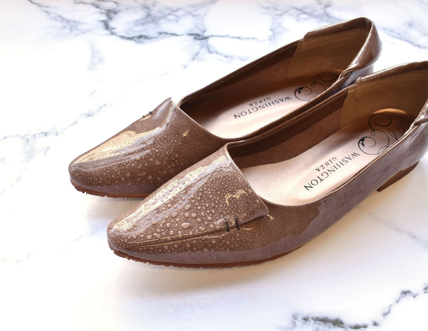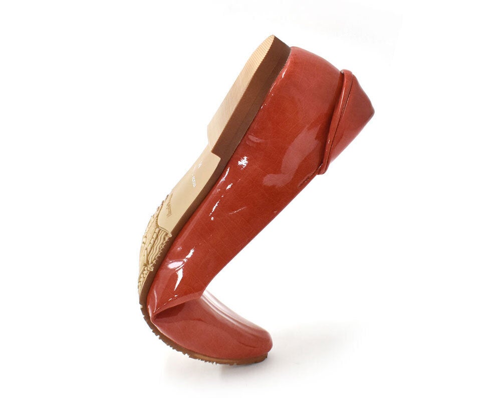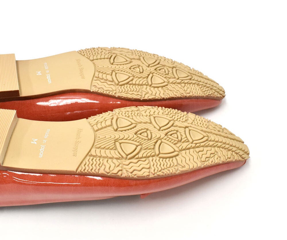 艶感があって上品なエナメル素材に、縫い目には止水テープを貼り、ソールと中敷きの間に防水シートを敷く事で、水の浸透を徹底的に防ぐ仕様にし、ソールには防滑仕様のアクアソールを施し濡れた路面でも滑りにくいレイン対応することで雨の日でも安心。