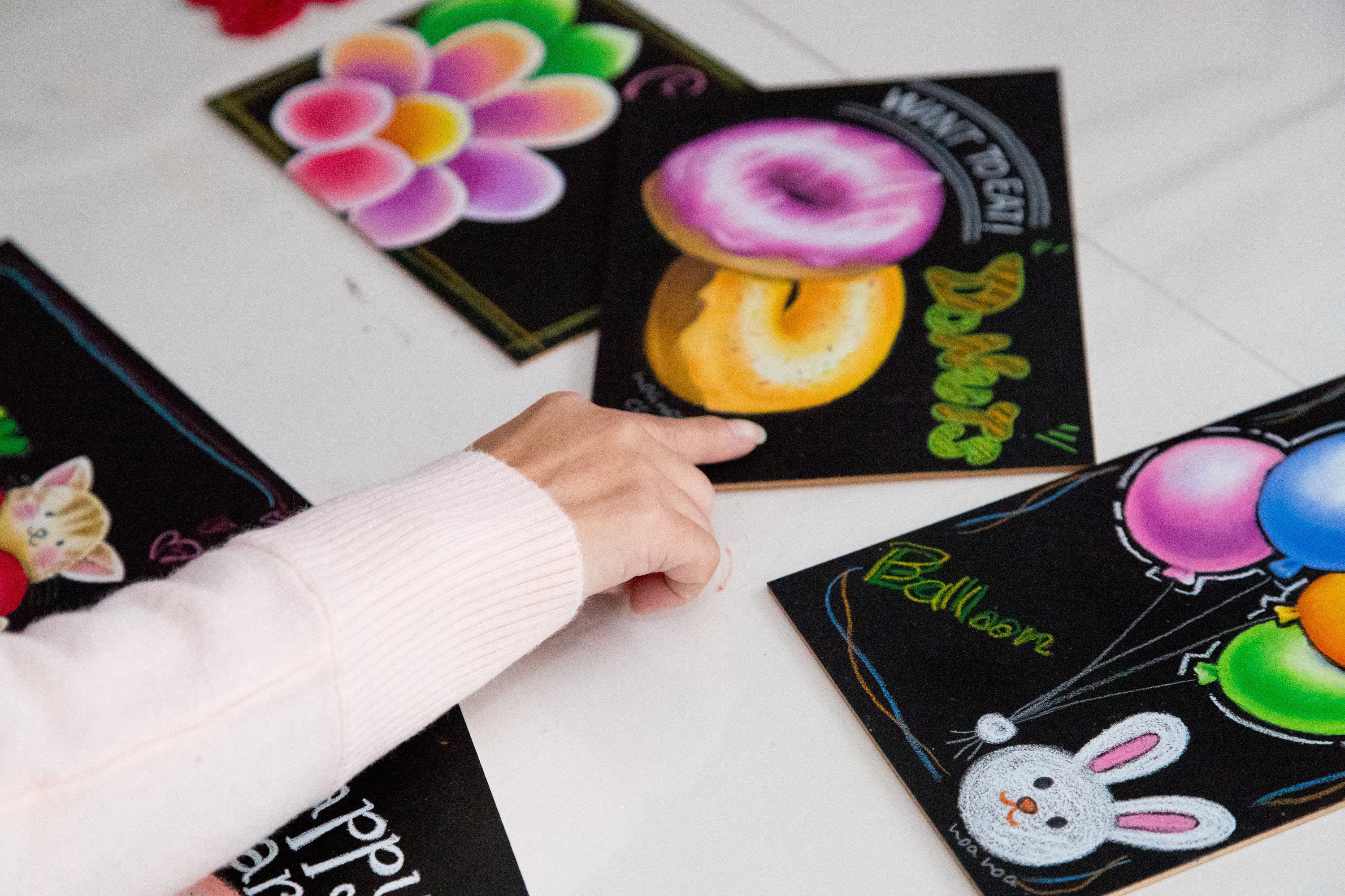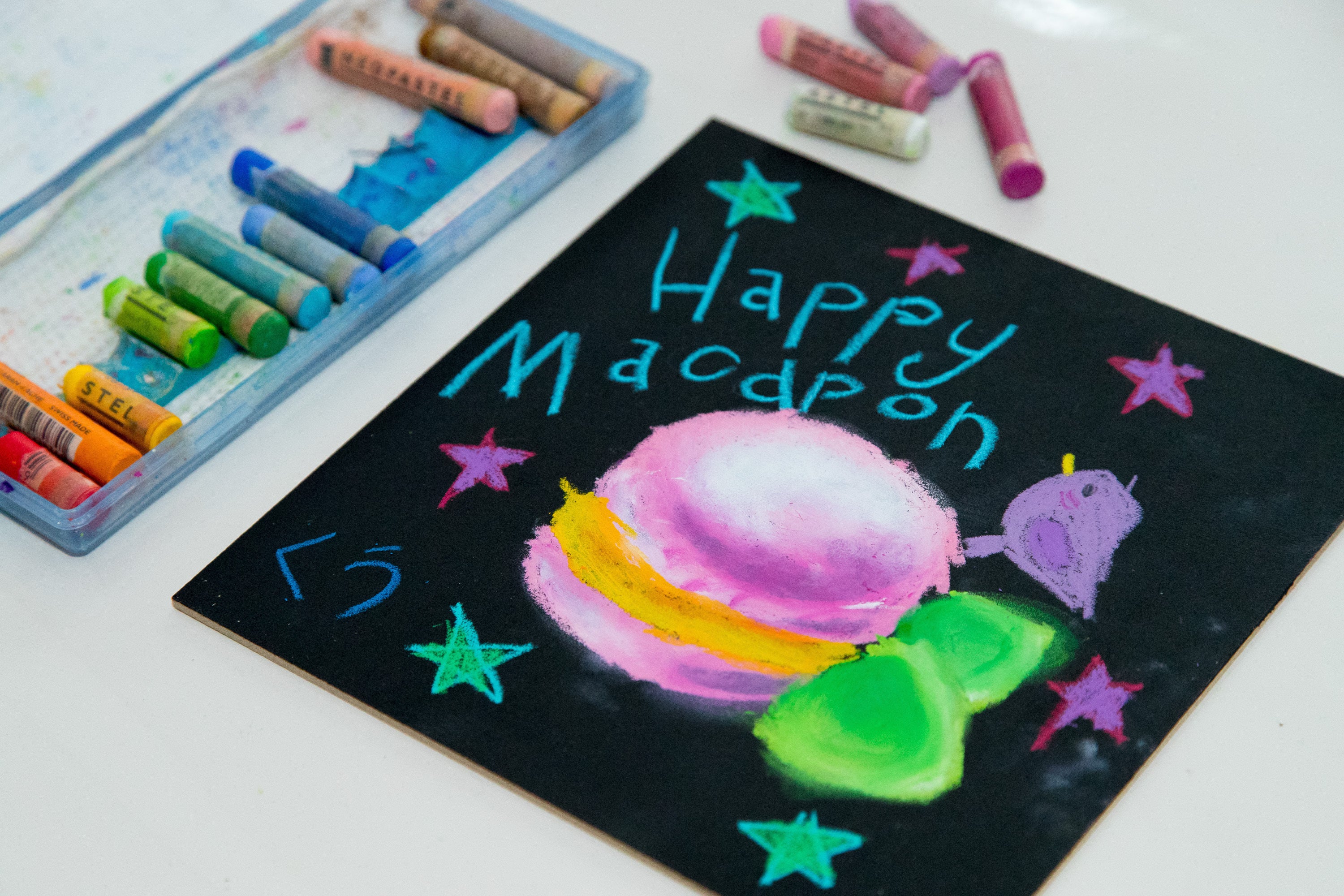 チョークアートは、クレパスに似たオイルパステルという特殊な画材を使って、指で描くアートです。