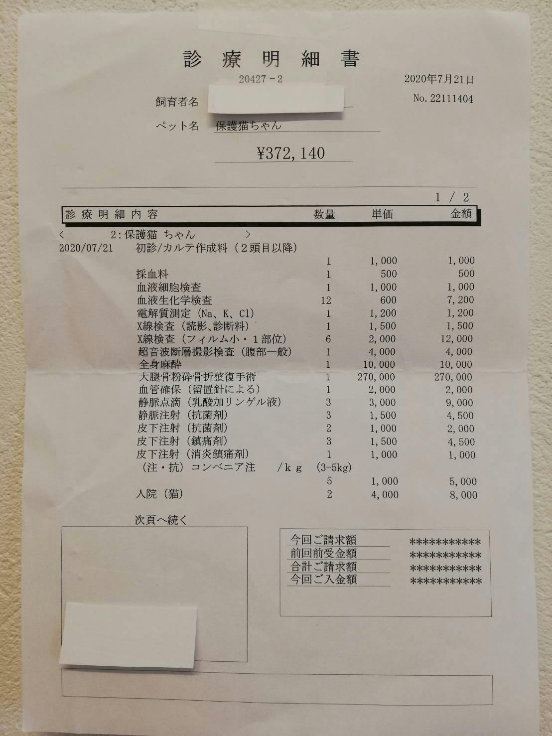 今回突然の出来事で事故直後の病院でネコちゃんの治療・手術の決断を迫られ、ただ救いたいという一心で後先を考えずに治療を行いましたが、経済的に大きな負担となってしまっています。