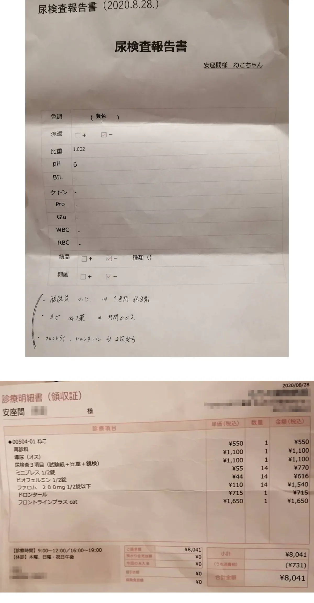 結果は、尿内の細菌、結晶は無くなり良好との事。