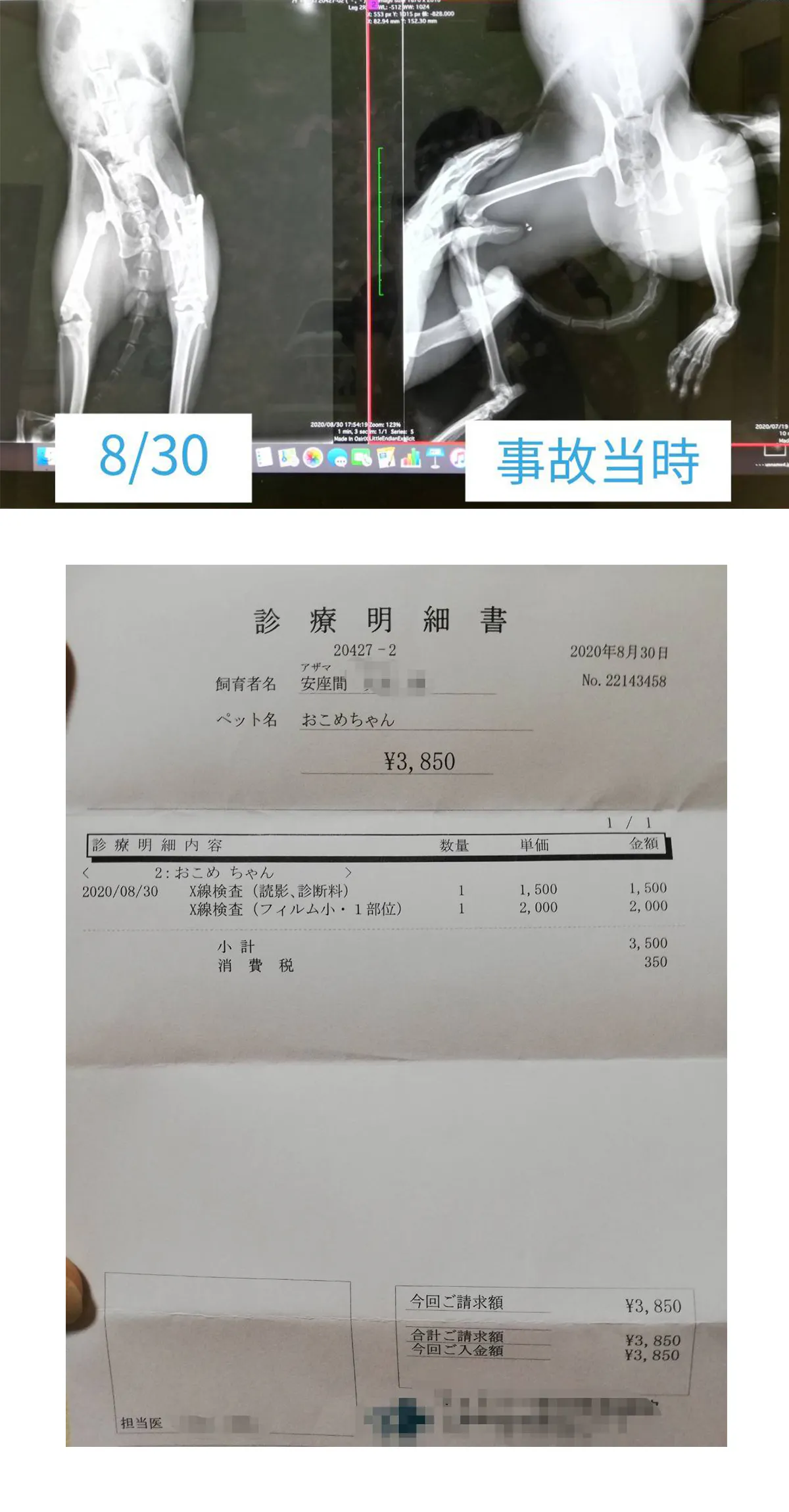レントゲンによると歪みが悪化していたり新たにヒビが入っているような箇所はなく、左脚をかばって歩いていて右脚に負荷がかかっていることによる症状だろうという診断で、ひとまず様子を見ることになりました。
