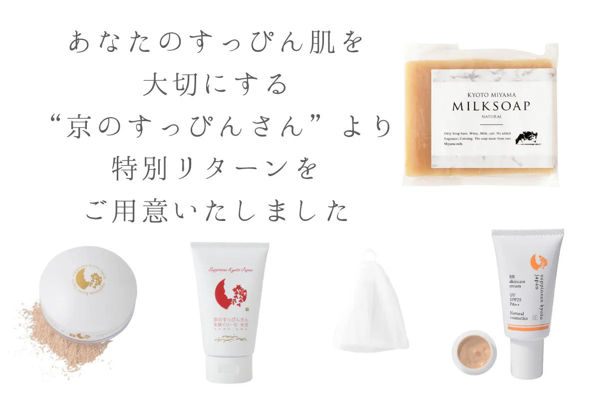 京のすっぴんさんシリーズでは、せっけんだけでなく、自然素材を使った京コスメを展開しています。そちらも合わせて今回のリターンとさせていただきました。