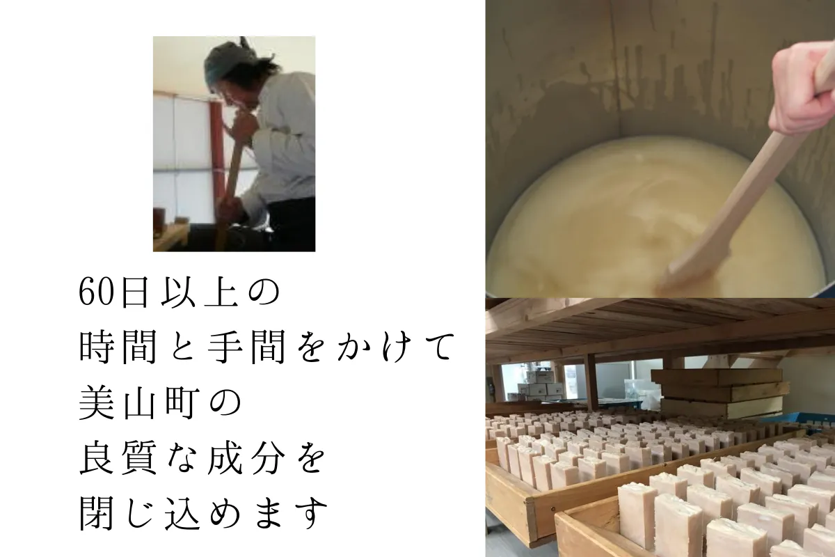 コールドプロセス製法で、素材に熱を加えず低温でじっくり鹸化し、ゆっくりと60日間熟成することで美山町の原料を活かしています。