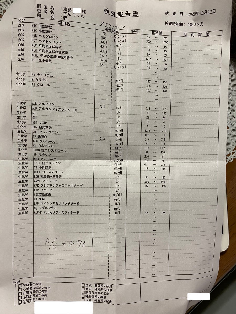 今日は外注検査にも出してもらい、そこでFIPに関する数値が正常であればこのまま経過観察に入り、1ヶ月ごとの通院(計3回)になるようです。経過観察もクリアすれば無事に寛解。となるようです。